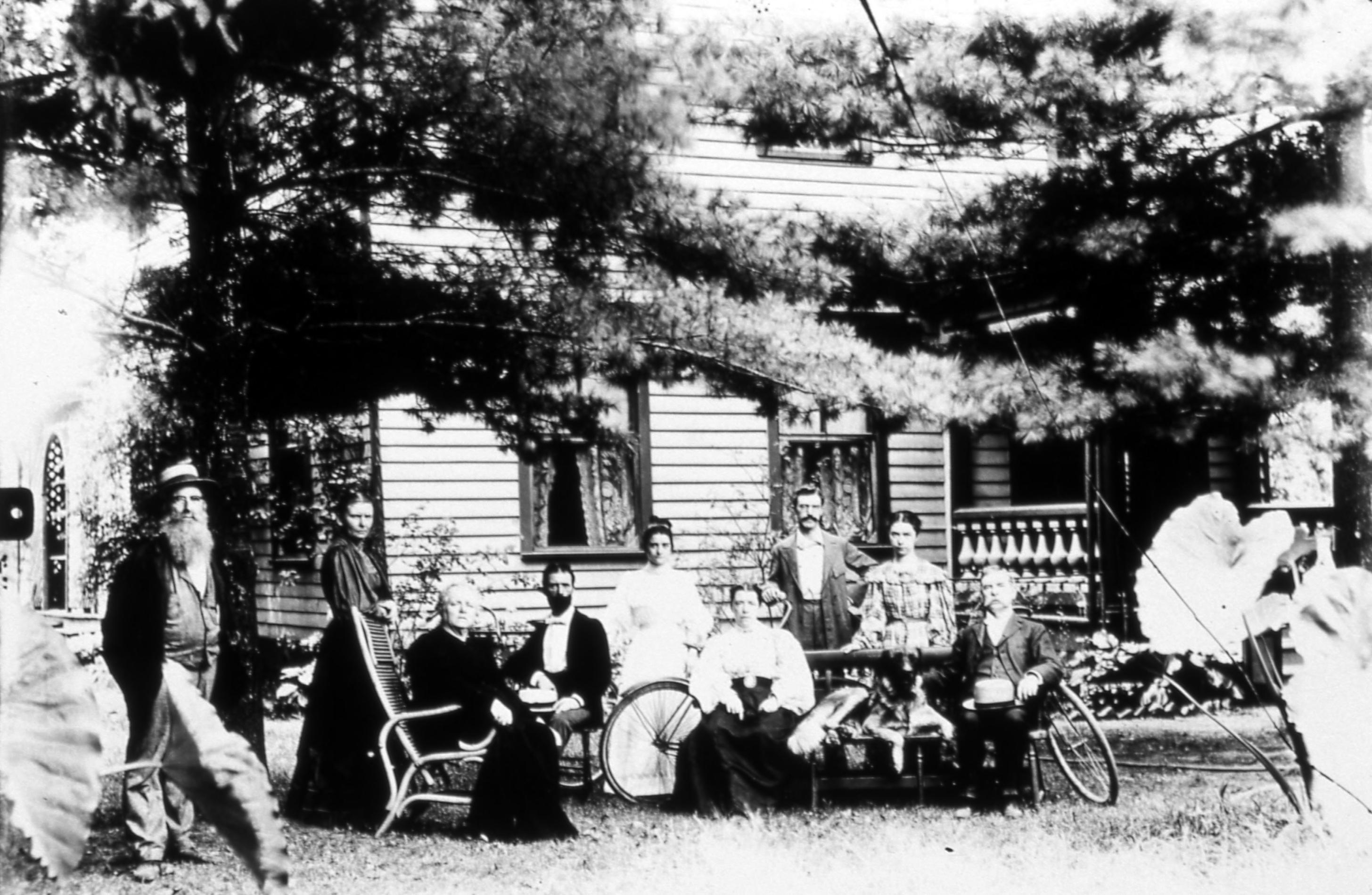 Golden Family: This photo shows the family, some seated and some standing, in the front garden of their house facing Church Street. The photo includes the family dog, and two bicycles.