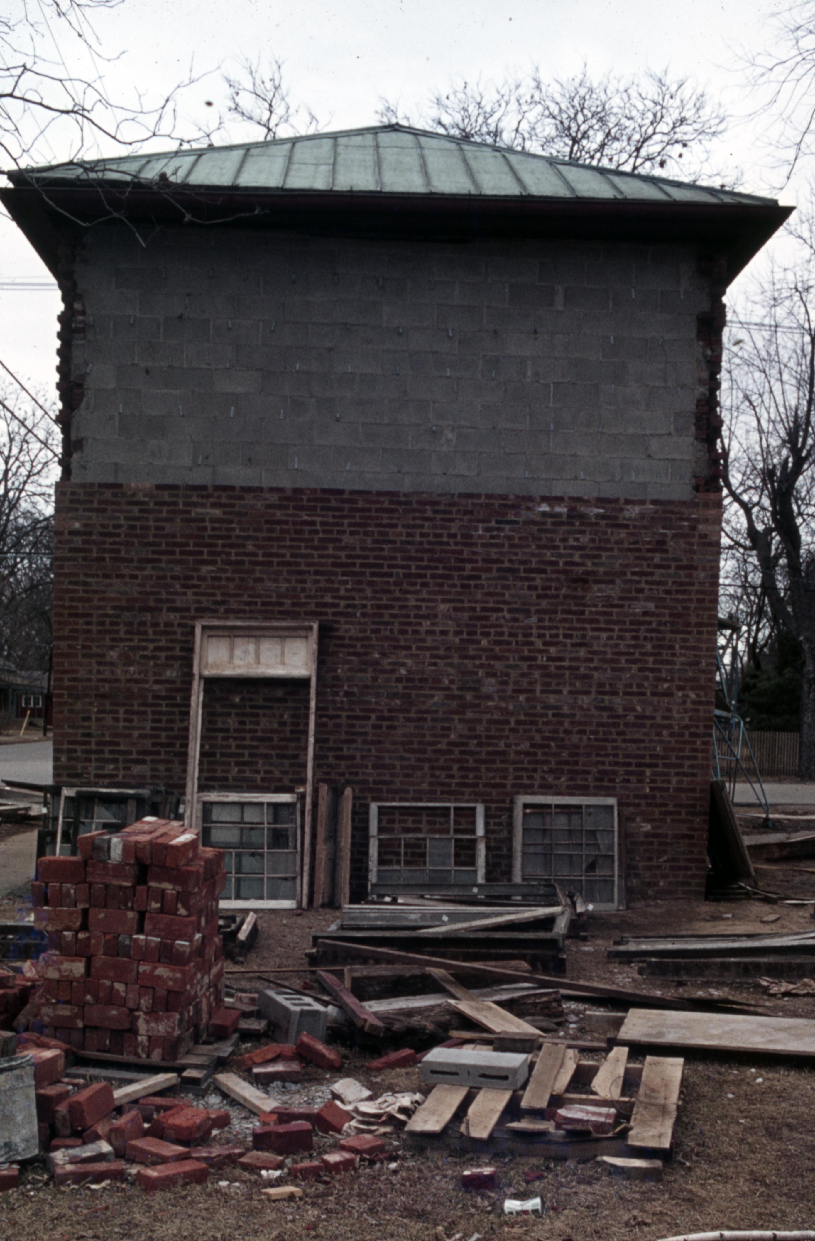 1830 Owen House: The second floor of the west side of the 1830 Owen house has been walled with cinder blocks (concrete blocks) in preparation for the red brickwork to follow.