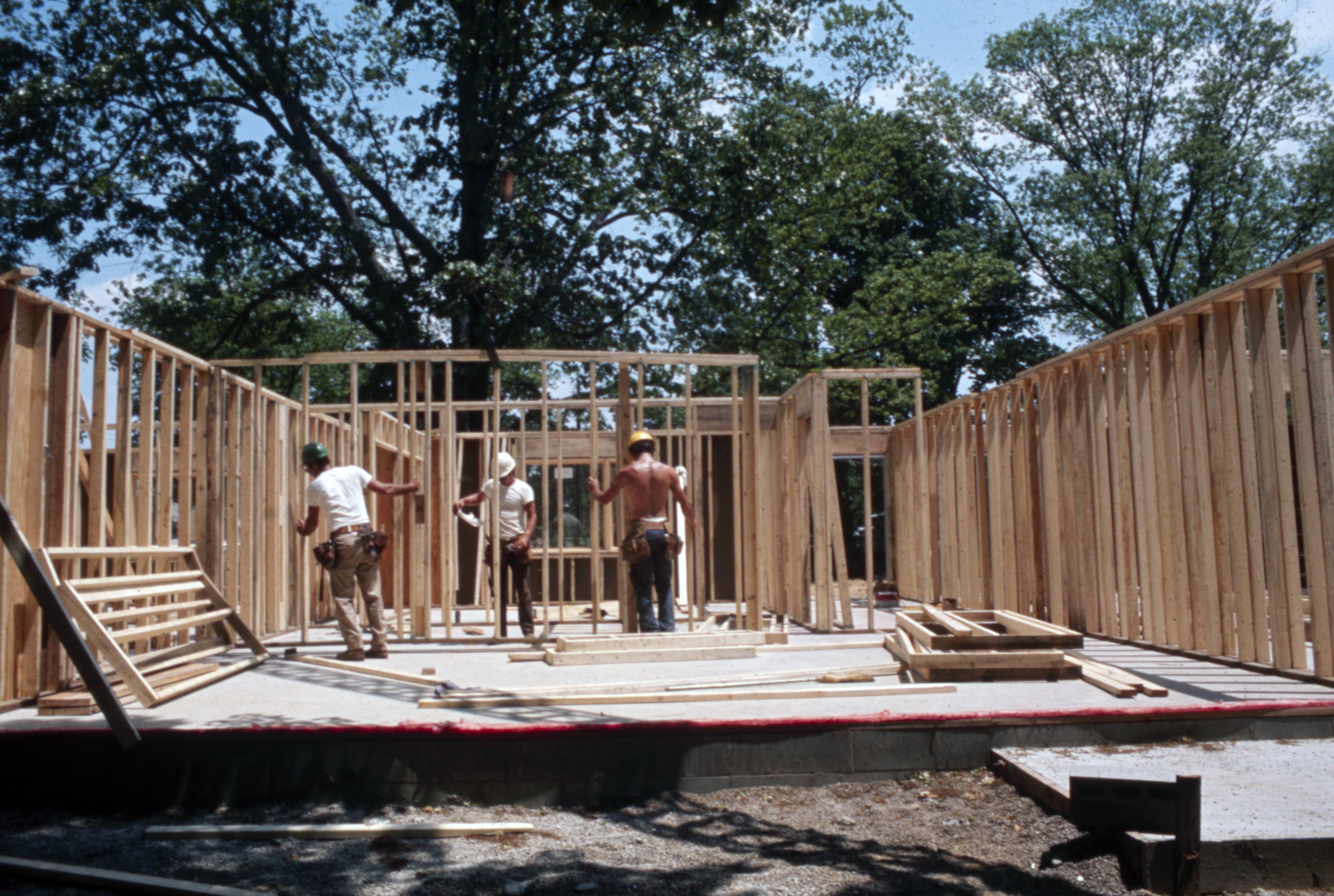 Lanark Development Collection: Construction of 820 Main Street New Harmony Indiana. Men working on the new construction.