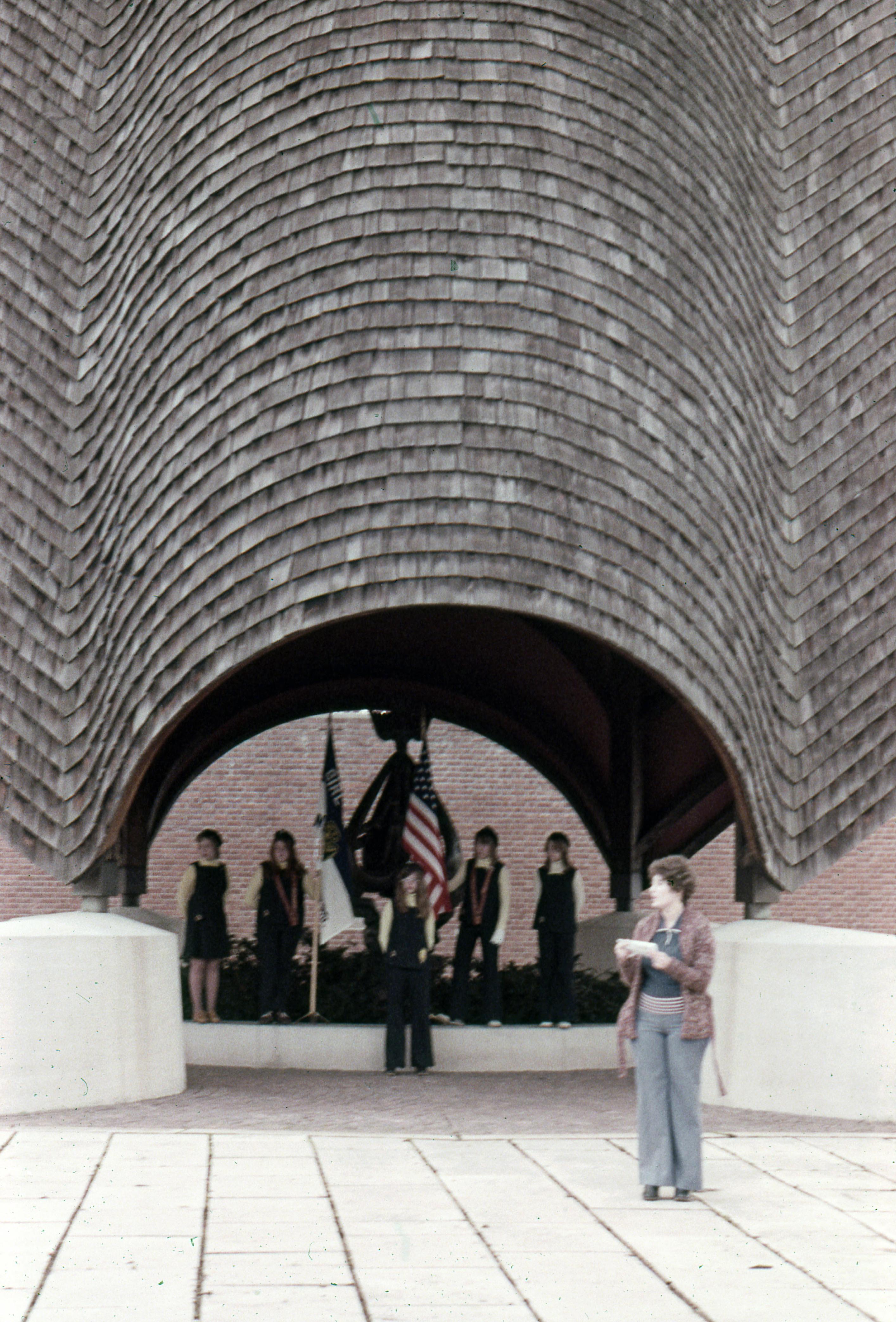 Group of children at ceremony in Roofless Church. The Roofless Church is located at 420 and was commissioned by the late Jane Blaffer Owen and built by architect Philip Johnson. The inter-faith church was dedicated in 1960 and is open to the public.