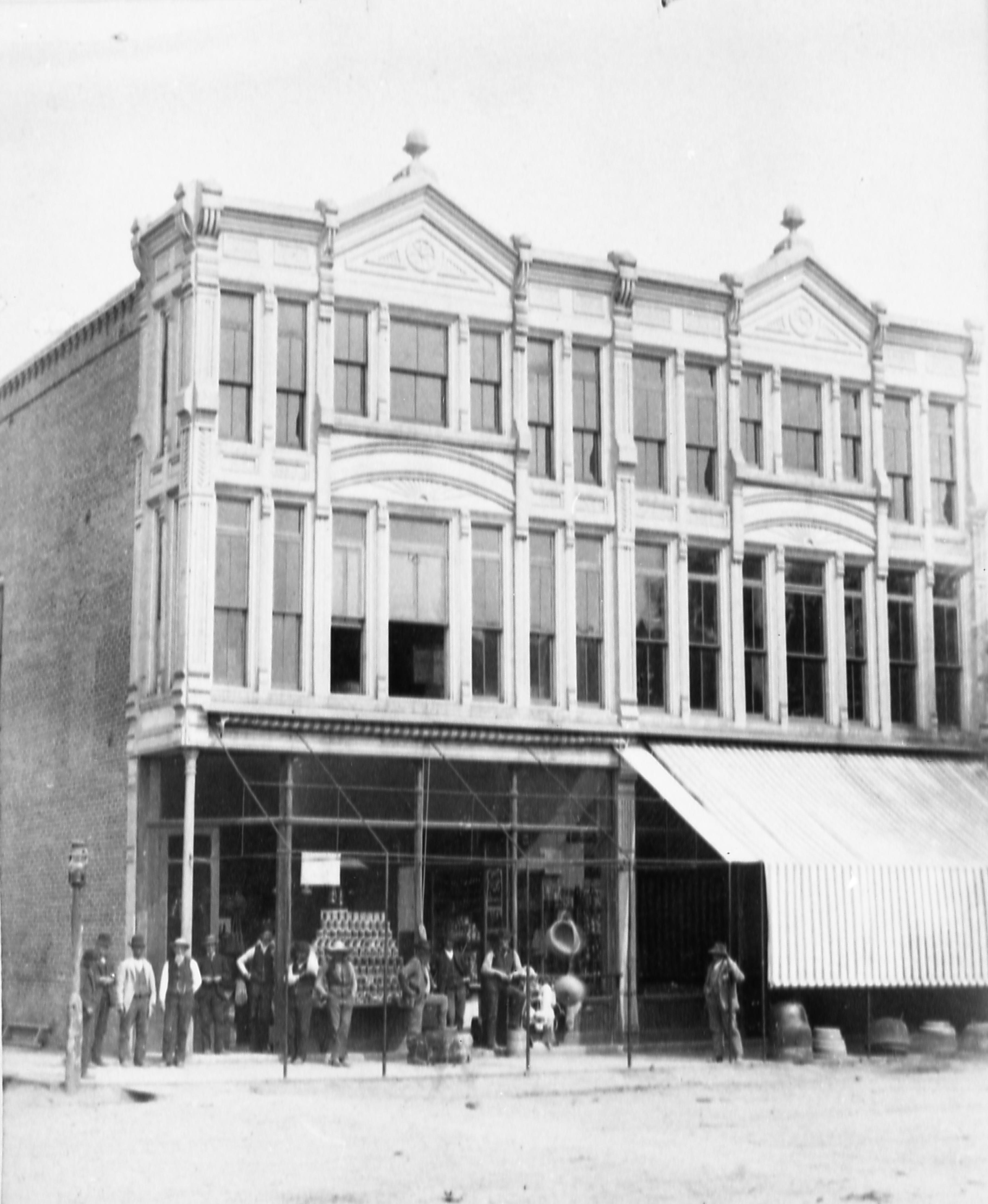 Transparencies and Negatives Collection: Historic photographs. This is a photo of the E. F. Owen and Company Store, which was located on the southeast corner of Main and Church. This grocery store had been at this location since before 1888 and had persisted until sometime in the late 1890s. This plat belonged to Owen and Company on the 1869 Plat Map and the other side of this building did indeed house a hardware and agricultural implements store. In all probability, this was the location of E. F. Owen and Company. By the mid to late 1890�s the Owen grocery store had been replaced with a clothing store, which only lasted a short time and was in turn replaced by Armstrong�s Place Saloon by 1907 at the latest. In 1920 the building on the left had been replaced with the New Harmony Bank which is still present in 2022.