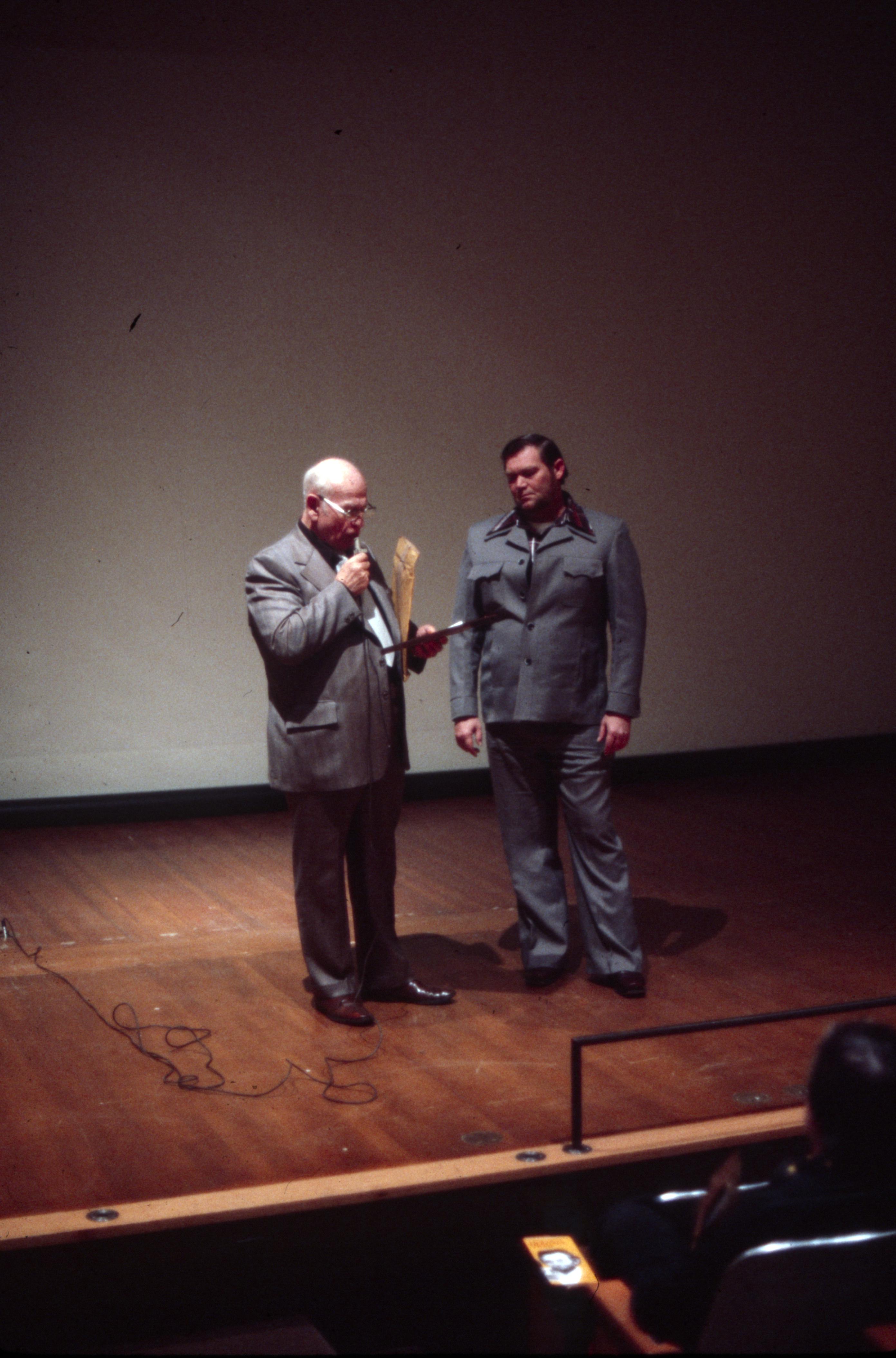 Murphy Auditorium: Murphy Auditorium is located at 419 Tavern Street and was constructed on the plat just east of the Working Men's Institute from 1911 to 1913, using the Doctor Edward Murphy Fund, and was built as part of New Harmony's centennial celebration of 1914. In 2014, the town's bicentennial, Murphy Auditorium became the new home of the concert series Under The Beams, originally housed in the Rapp-Owen Granary. Today, the auditorium is owned by the University of Southern Indiana and is the home of The New Harmony Theater with a seating capacity of 360 people. In this photo a man is giving a speech before giving an award to another man.