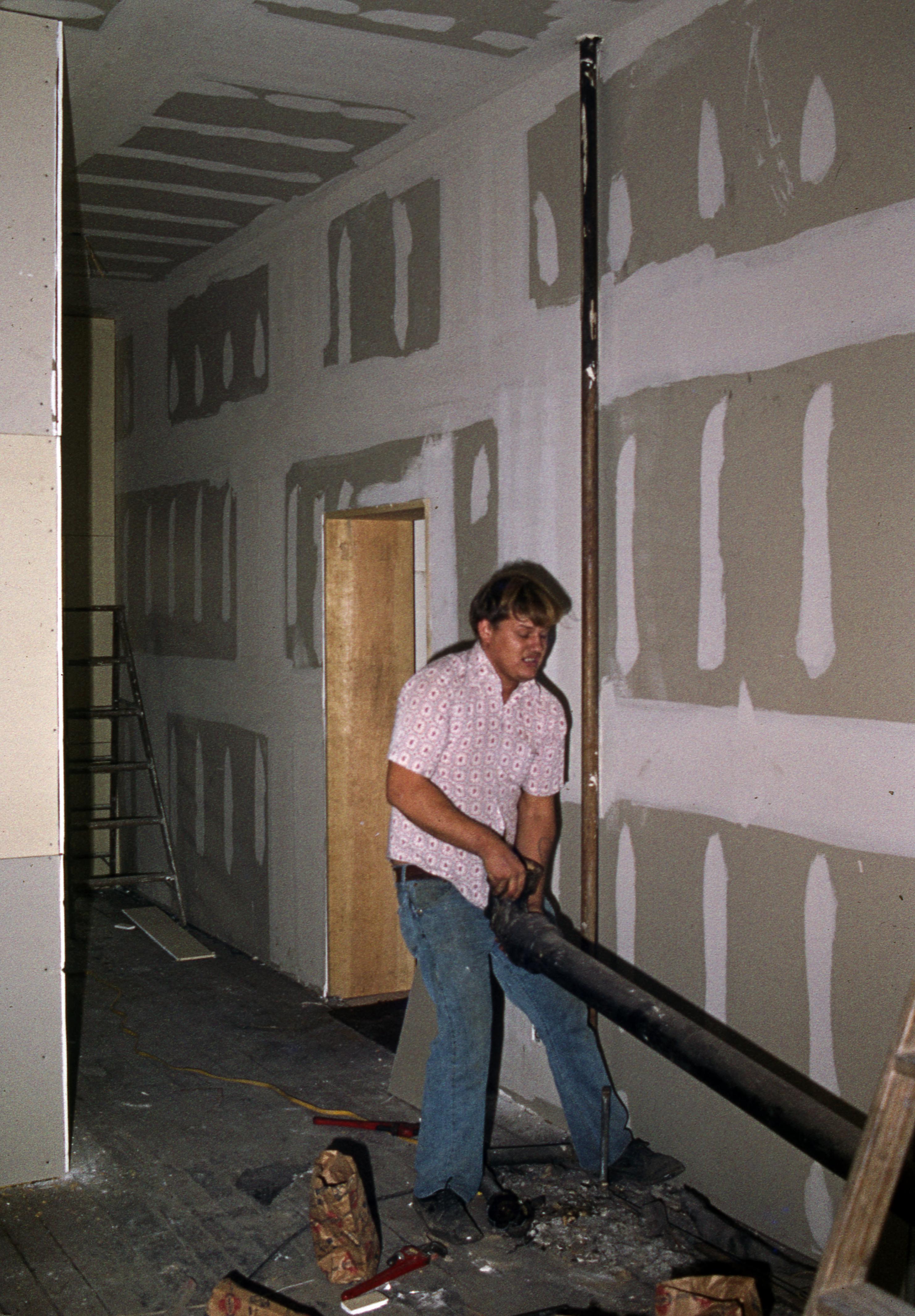 J. Breith Building: This building is located at 506 Main Street. The building started as a one-story wooden structure built by Jacob Breith (UA58 � 7516 far left) as a pharmacy and grocery store. The original building was demolished to make room for the new two-story brick structure at some point between 1893 and 1899. The Historic New Harmony Office was located on the second floor of the building in the early 1970s. The Kopper Kettle Gift Shop was located in the J. Breith Building during the early 1970s. After the J. Breith Building was renovated, it became home to the Imoko Plants shop, very briefly, before becoming a part of the New Harmony Gallery of Contemporary Art as the sales floor. In this photo a construction worker is moving a pipe during the building's renovation.