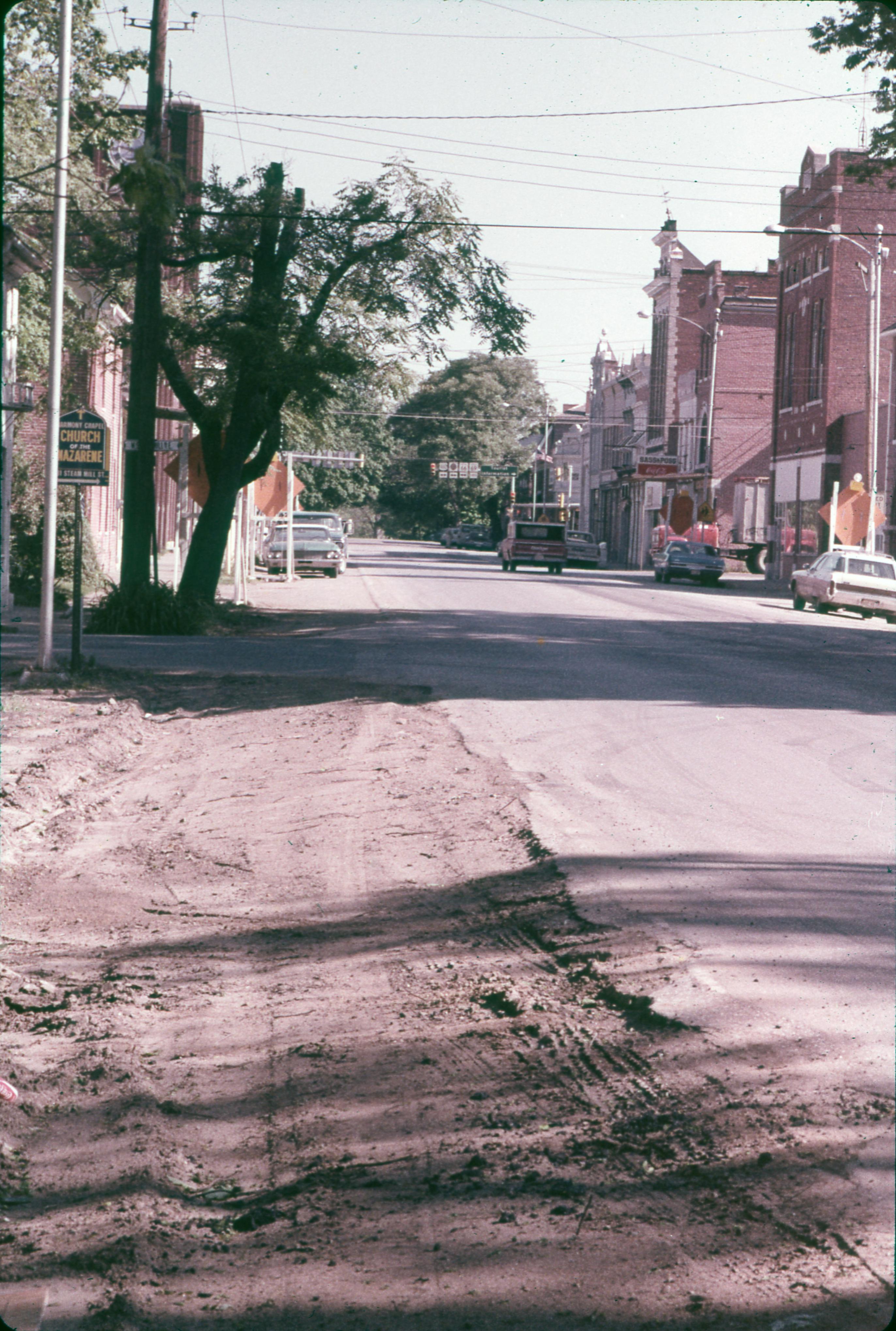 Streets Collection: Main Street. Main Street looking north from the intersection of Main and Steam Mill Streets. The street has been graded and is ready for pavement, contracted to Feigel Construction Corp. Harmony Chapel Church of the Nazarene Sign. On the left side of the photo is the Ribeyre Gymnasium and clock tower. On the right side of the photo, just north of the station wagon car, is what once was a harness and tack shop in the late 1800s and early 1900s but at the time of the photo was boarded up. Across the street on the right side is Sass & Poss Tavern.