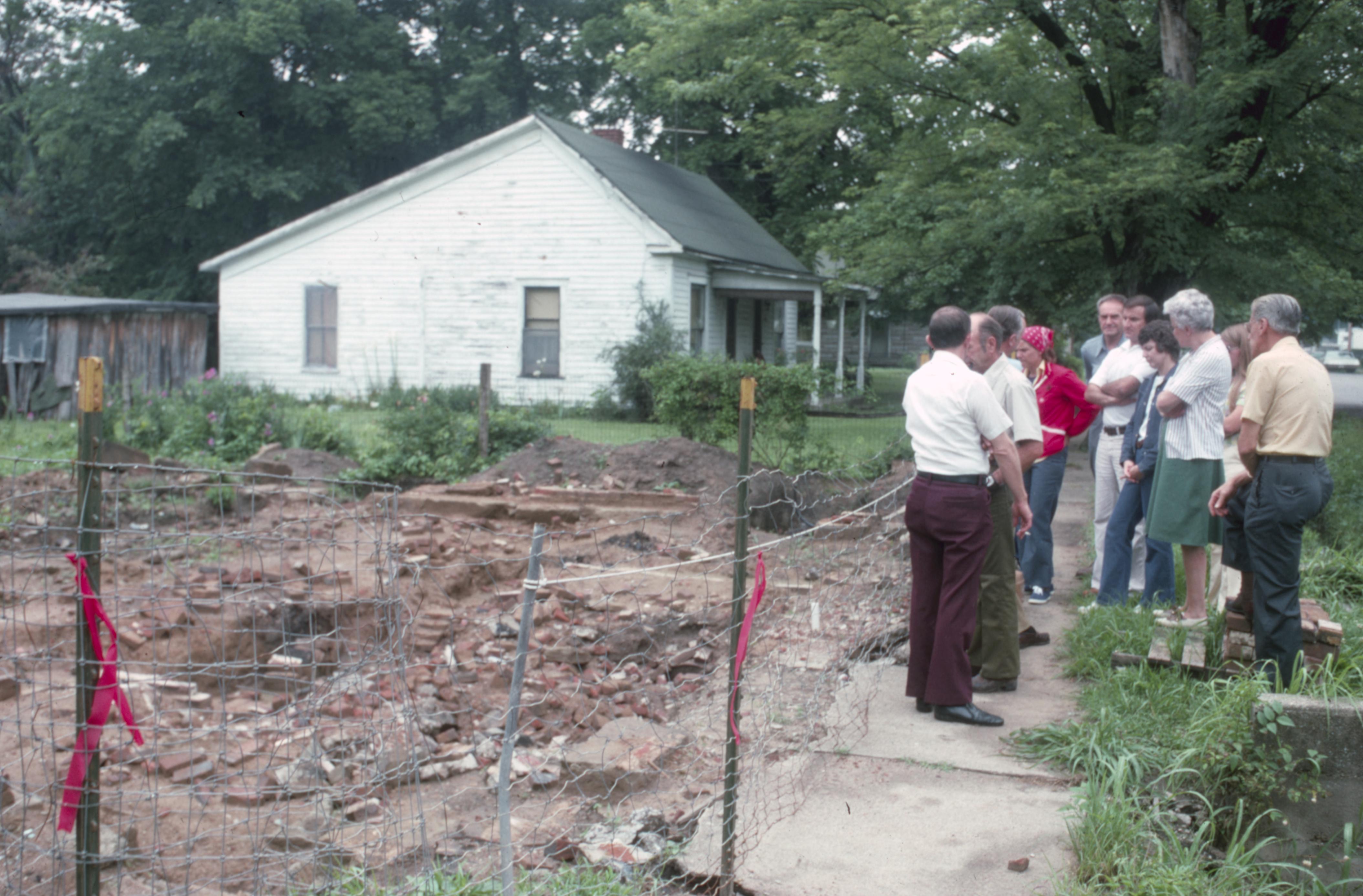 Indiana State University Evansville Archaeological Dig Collection: Solomon Wolf House. A group of people gathered at the dig. This dig site was located on South Street just east of 718 Main Street. This building was moved to 601 Granary Street for the construction of the Tree of Life Clinic.