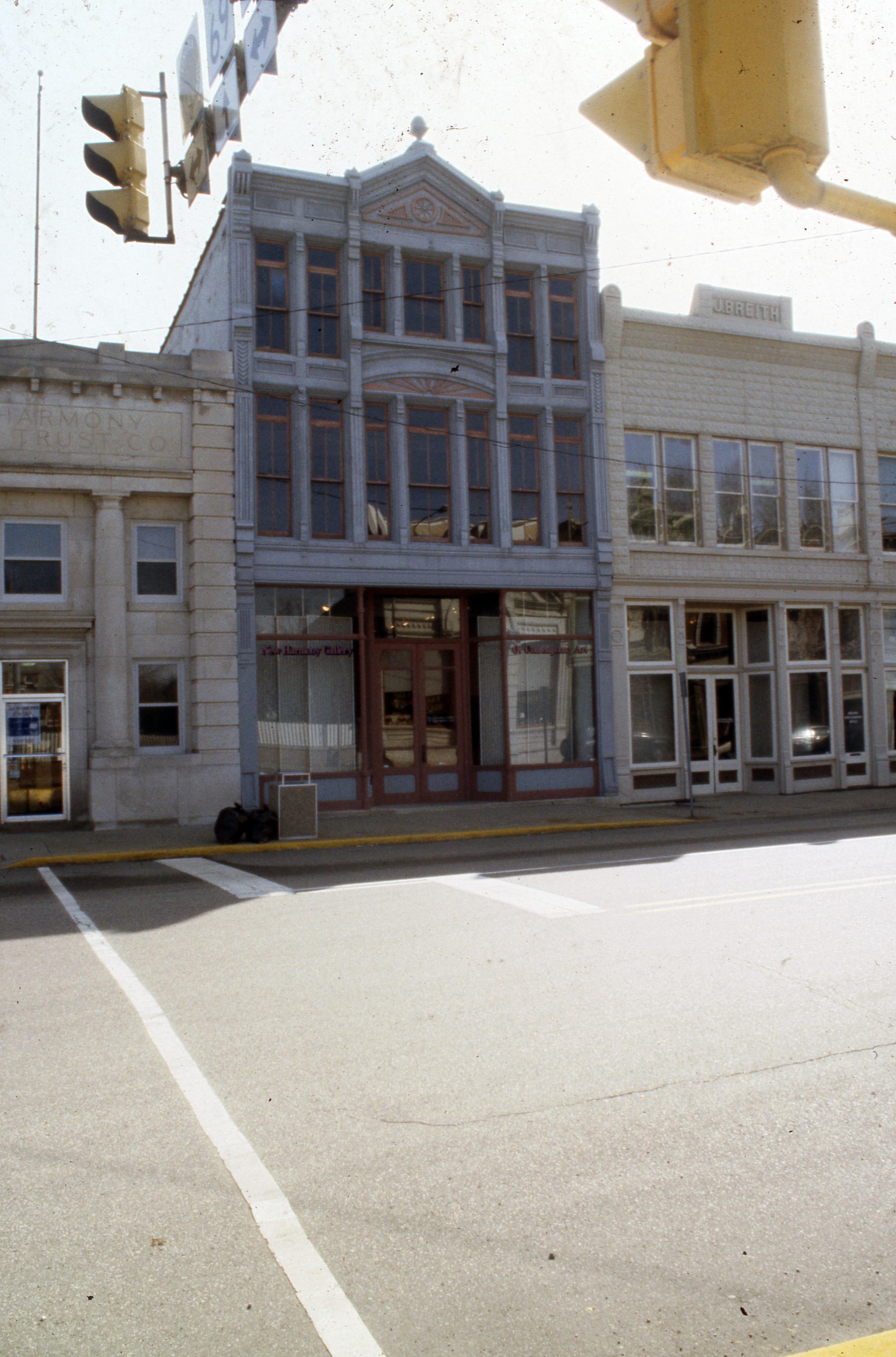 The Owen Building: This building is located at 504 Main Street and was once the right side of 502 Main Street. The two buildings combined have a long history, being built before 1888. They were the location of E. F. Owen and Company�s store, this side being the hardware shop at least until 1907 or later. New Harmony Gallery of Contemporary Art now located in both 504 and 506 Main Street with 506 being used as a sales floor. The art gallery, opened in the fall of 1975, after the building went through refurbishment and is still a part of the University of Southern Indiana today (2021). The gallery is a not-for-profit space for artists to hold exhibitions of their work with a sales floor in the adjoining building at 506 Main. This photo of the building was taken from across Main Street near the corner of Main and Church.