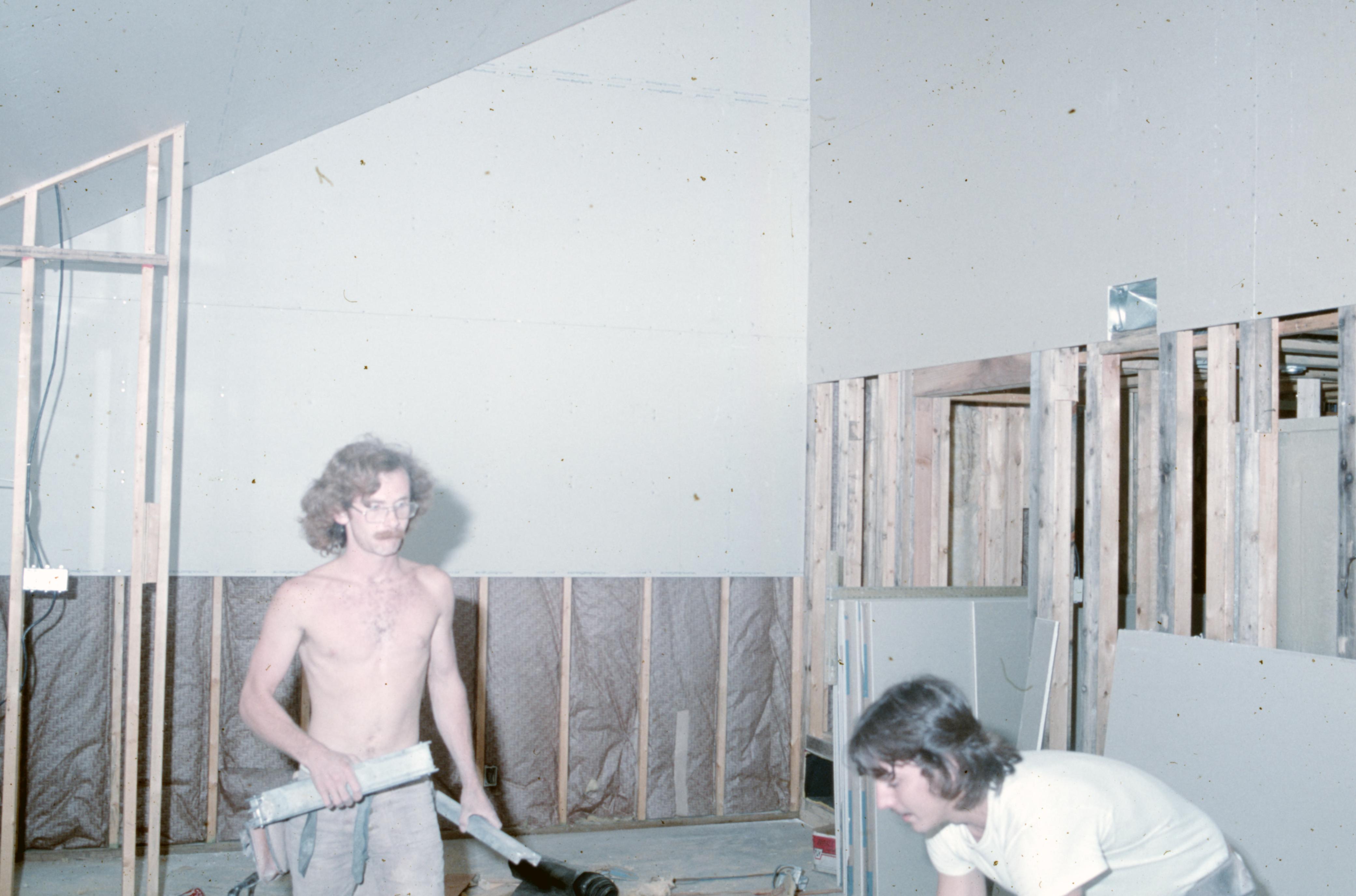Lanark Development Collection: Construction of 820 Main Street New Harmony Indiana. Workmen finishing of the interior walls and floors.