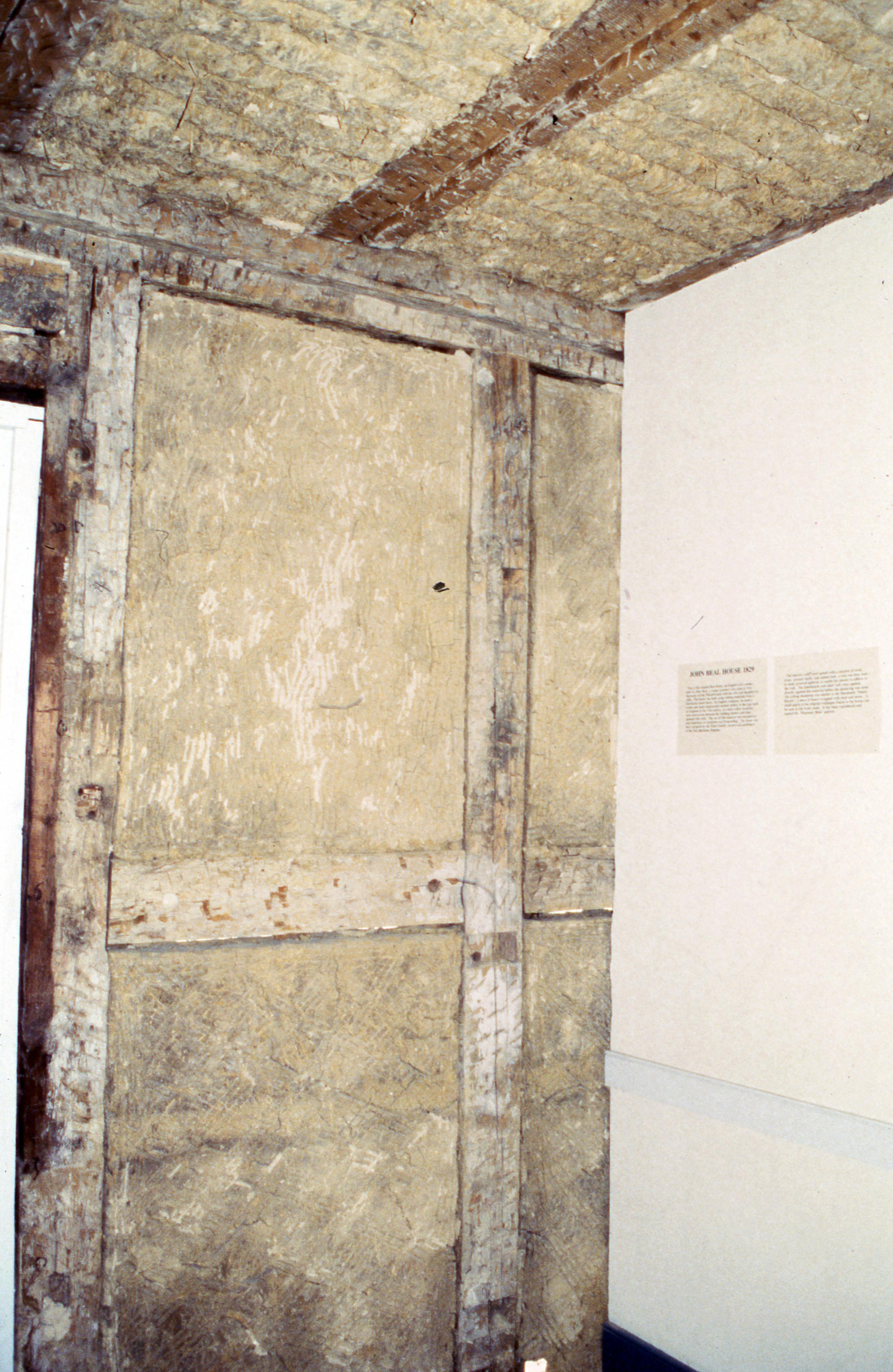 Beal House: The Beal House was moved during the Lanark Construction, on Town Block 8 E/W on Main Street to 611 Church Street. The Beal house was constructed around 1829 by John Beal, who was a carpenter in the Owen and Maclure community. Beal constructed the house from lumber and timbers from an older horse barn. The new location would be the site of the Beal House and 1850s Doctor's Office (The Doctor's Office was a remodel of the Kemmerling House, which was also moved to this site). Elmer Buchta Moving Engineers was contracted for this and many other building moves during the 1970s. This photo shows an inside timber frame wall filled in with ""Dutch biscuits"".