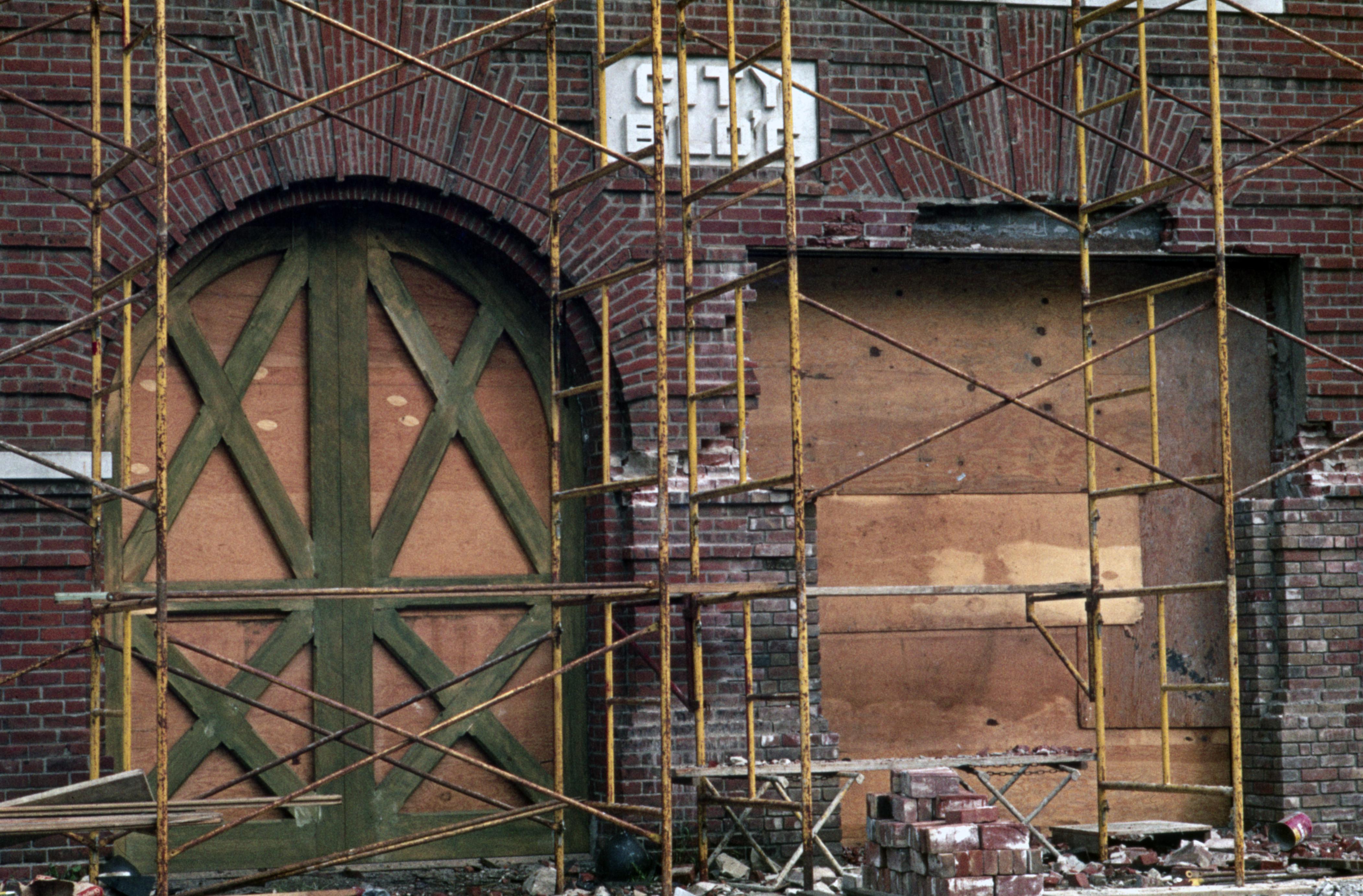 The City Building: This building is Located at 608 Main Street and housed the firehouse on the ground floor and City Hall on the second floor. The photo shows the continuation of the rebuilding of the brickwork on the right side of the building.