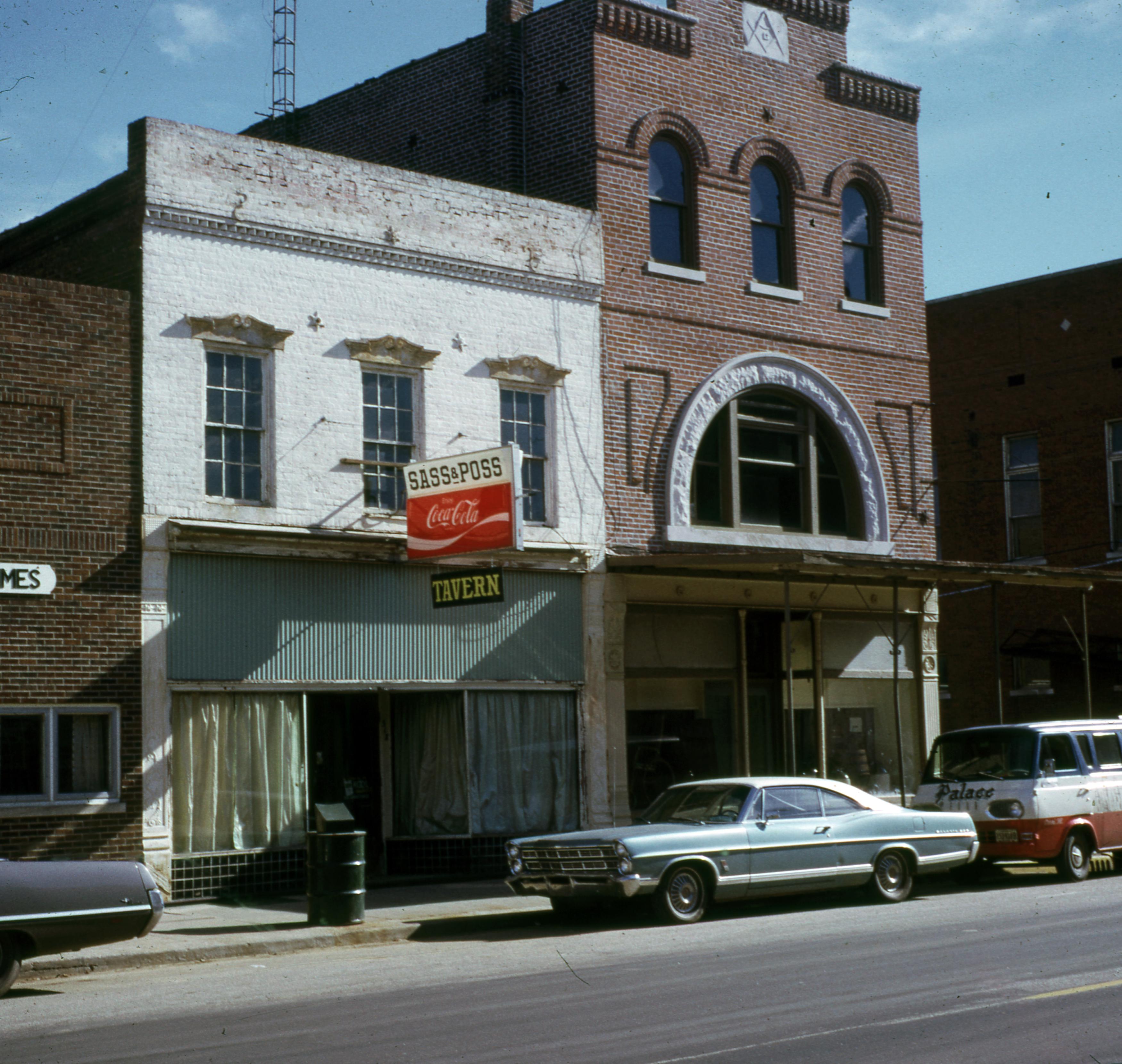 Streets: This is a photo of a section of the east side of Main Street, on the south end, near the corner of Main and Tavern. From Left to right: The New Harmony Times newspaper, Sass and Poss's tavern, an antique store, and across Tavern Street is the old Independent Order of Odd Fellows building.