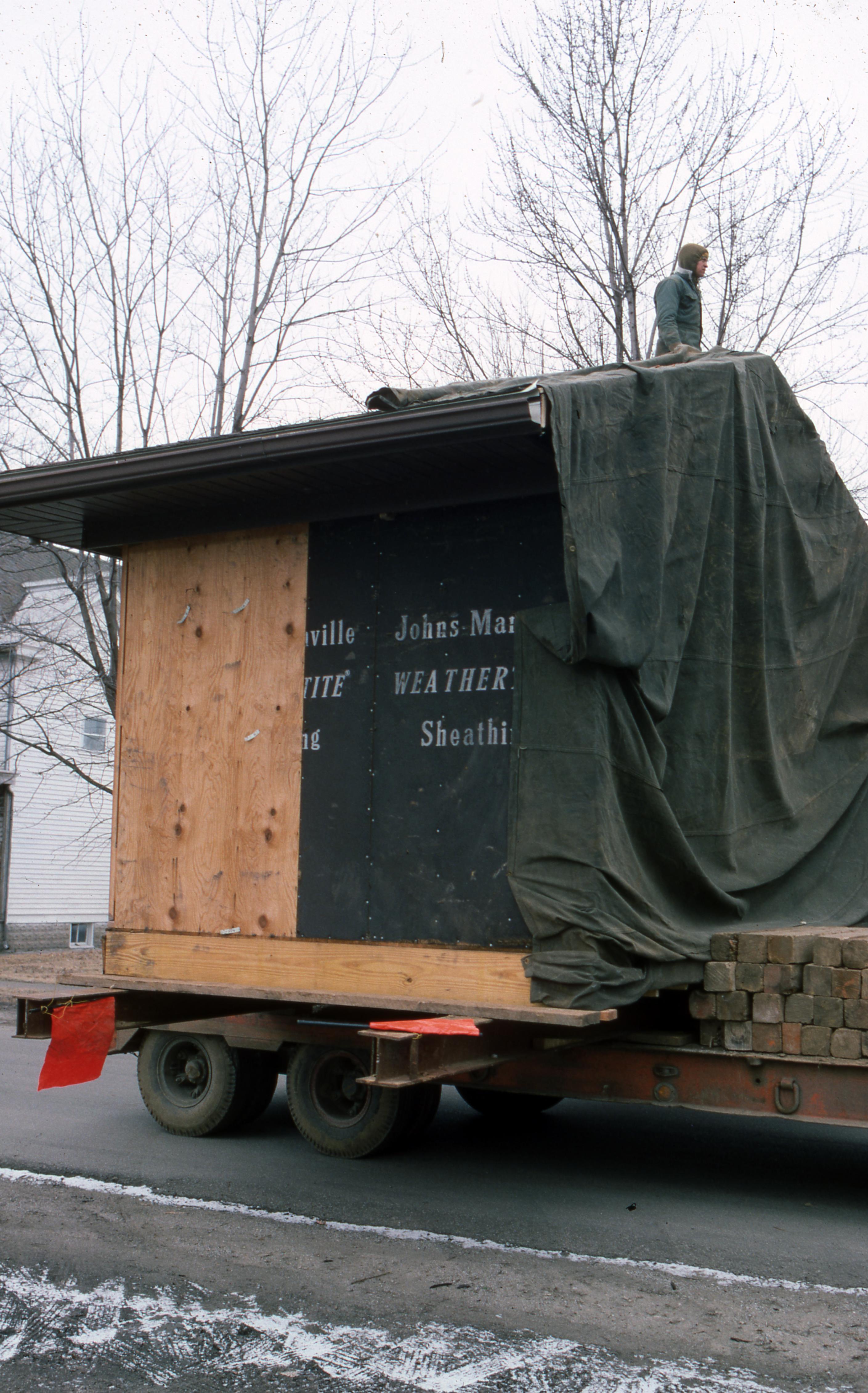 Bauer House: This house was originally located on the north side of North Street in town block 2 C/E. It was moved to the new location at 518 First Street before construction on the Atheneum had begun. Elmer Buchta Moving Engineers was contracted for this and many other building moves during the 1970s. This photo is of the back part of the house, which was moved as a separate part from the main house, enroute to the new plat at 518 First Street.