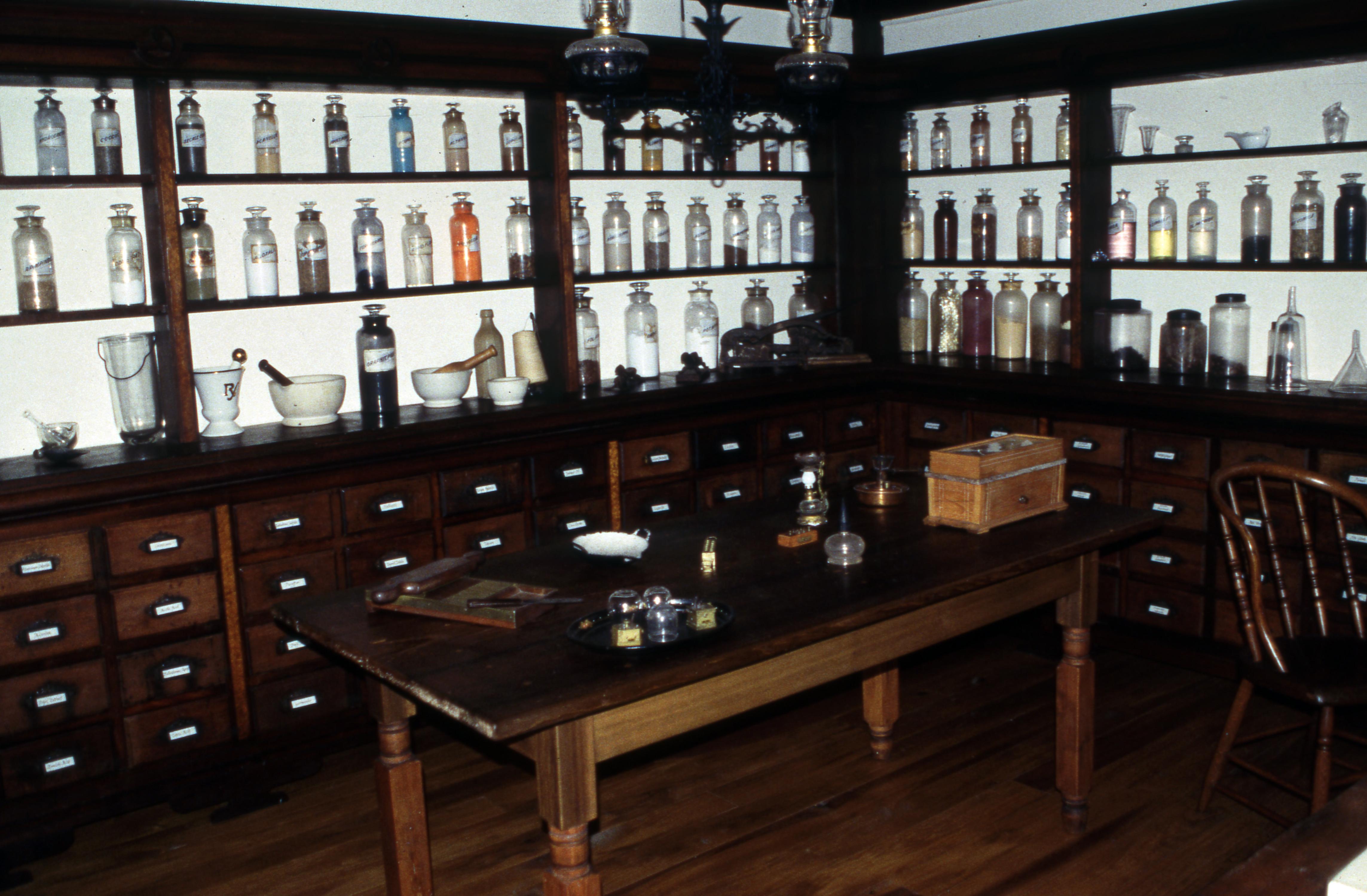 Kemmerling House/1850s Doctor's Office: The Kemmerling House was relocated from town Block 4 J/SE to the new location at 611 Church Street, beside the Beal House. The Kemmerling House was remodeled into the 1850s Doctor's Office, a gift to the town of New Harmony from Mead Johnson. The Kemmerlings were listed in the 1882 Posey County Directory (as Kimmerlin) as being New Harmony Township farmers. Elmer Buchta Moving Engineers was contracted for this and many other building moves during the 1970s. This photo shows the pharmacy counter in the 1850s Doctor's Office. Note the shelves full of nineteenth century pharmaceutical chemicals and the row of mortar and pestles on the bottom shelf.