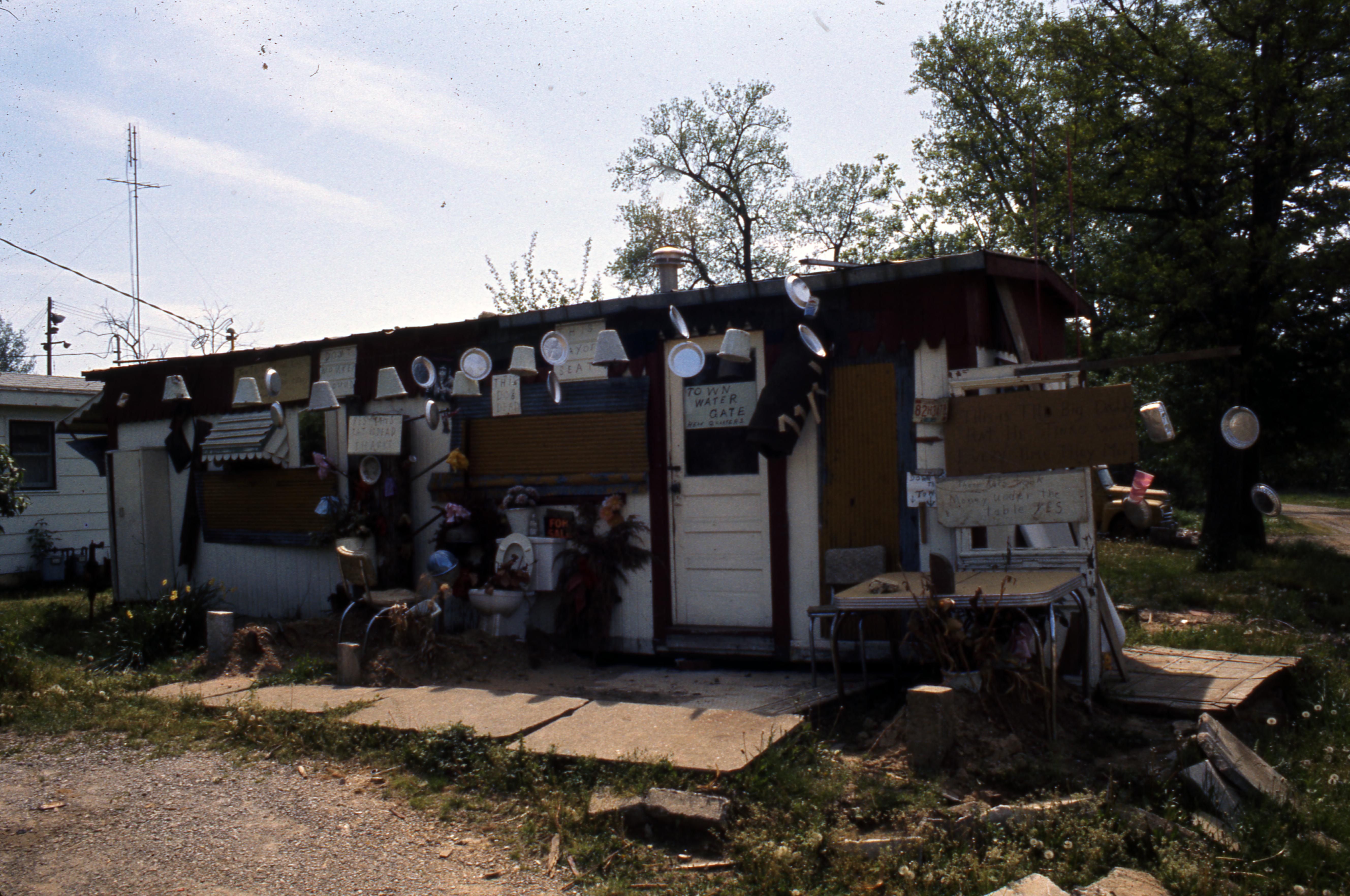 Hungaut House: This family was at the center of town dissention (See UA58 3490, read the posted signs). The small houseboat was burned in May 1975. The small white house was relocated from 3 B/NE, on the north end of Arthur Street, to 906 East Street.