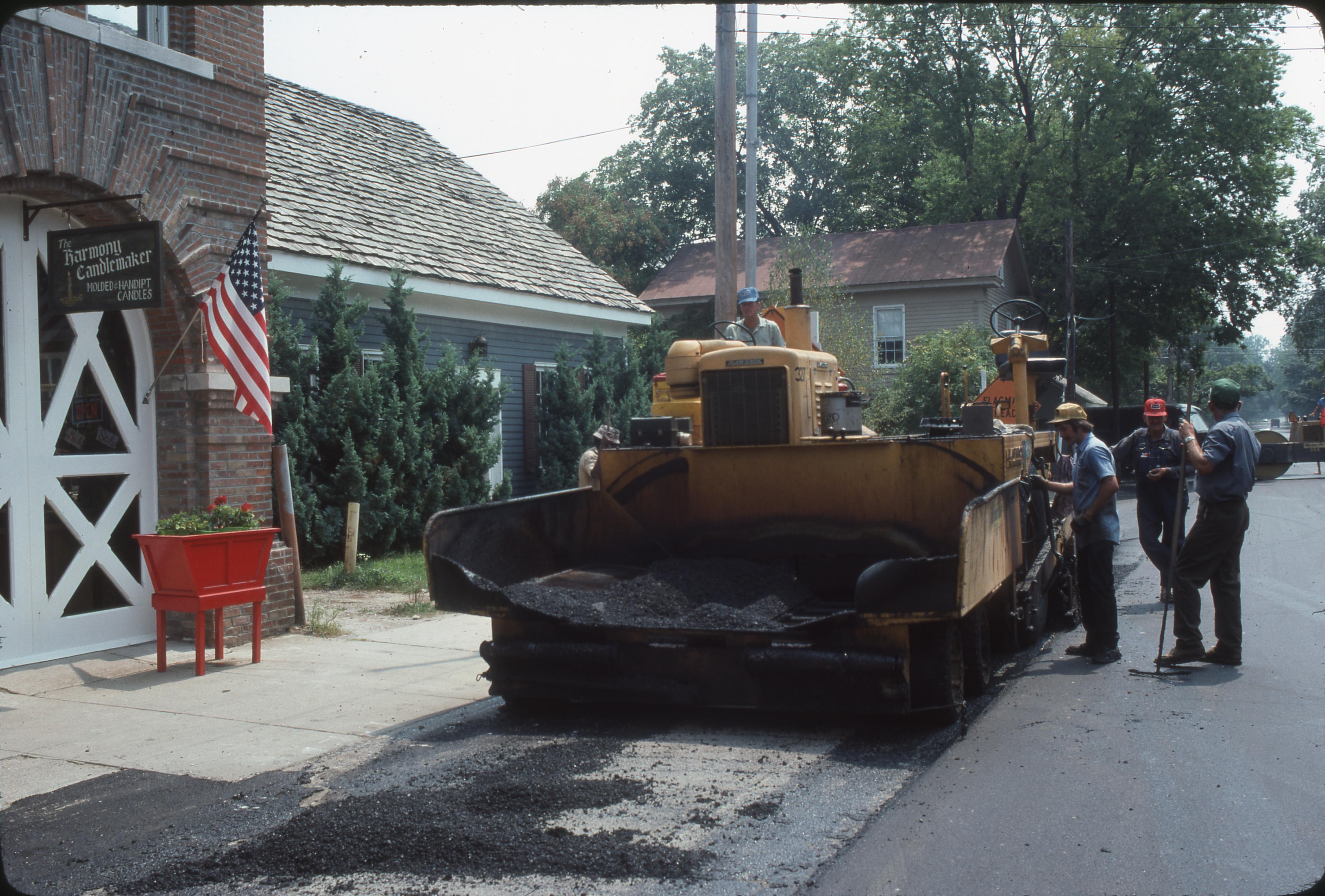 Streets Collection: Main Street. Main Street facing south toward the intersection of Main and Steam Mill Streets. Workmen in the process of paving Main Street. Feigel Construction Corp was contracted for this job. On the far left of the photo is the old Firehouse which held the Harmony Candlemaker, the next building south, which as of 2020, is the Golden Rose store, third from the left is located at 618 Main Street.