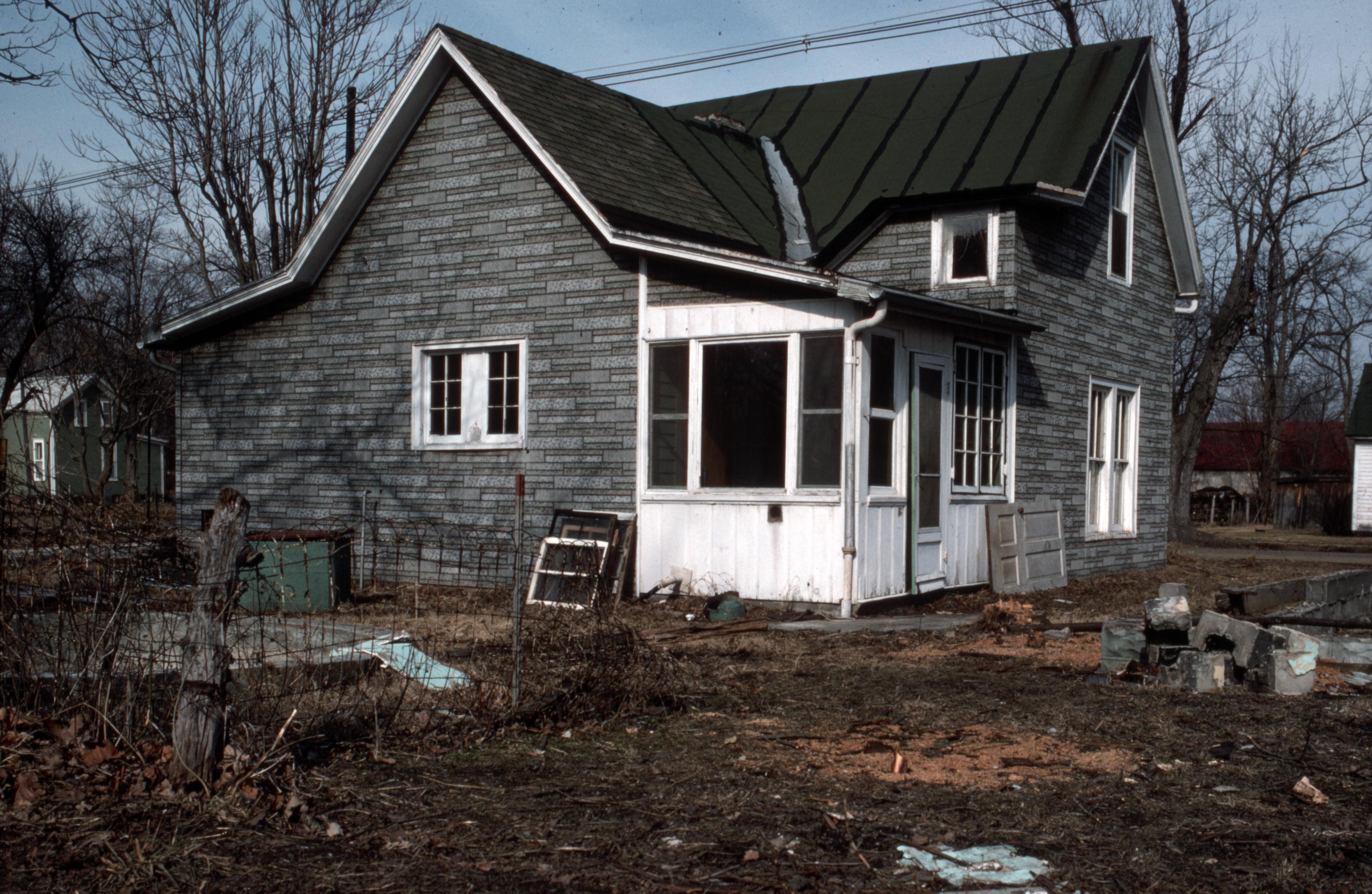 Lanark Development Collection: Construction of 820 Main Street New Harmony Indiana. Small gray house, facing South Street, before being demolished.