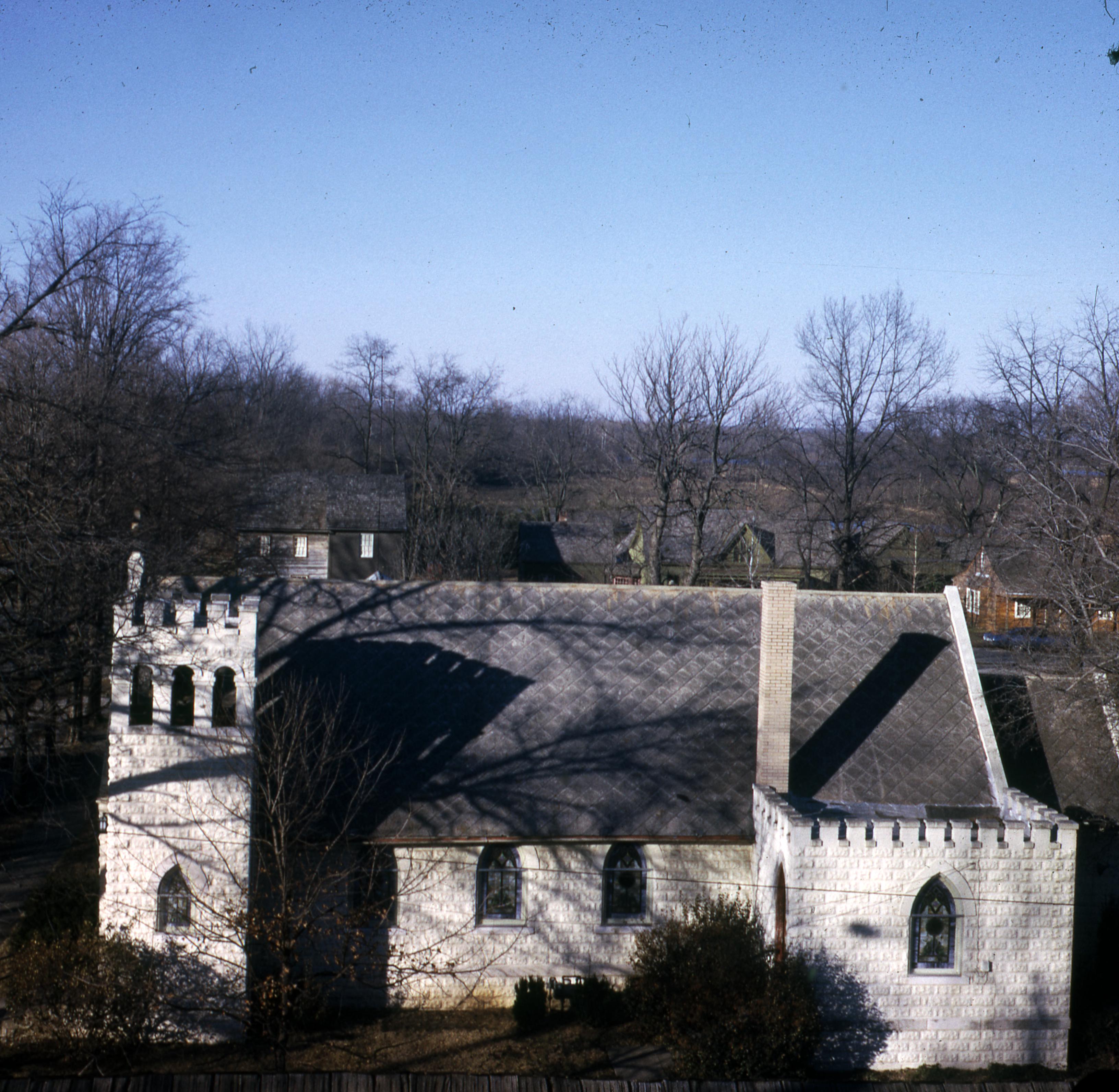St. Stephen's Episcopal Church: The church was first organized in 1841 and in 1843 the west wing of the old Rappite church was given for use by the Episcopal�s by Alexander and Anne Maclure. At this time the old burial ground was also given to the church, which was bought back by the Rappites in 1846. Then in 1850 the Episcopal�s sold the west wing of the old Rappite Church for $1000 and in 1854 St. Stephen�s Church was constructed, the North Street location where the Lenz House now resides.1888 saw the construction of a new belfry add to the church to accommodate the new bell. In 1911 the new church was built, and an addition was made to it in 1927. The church is still present as of 2022. This is a photo of the church, possibly taken from the roof of the Dyer House next door, or possibly from the upper floor of the Rappite Community House No. 2.