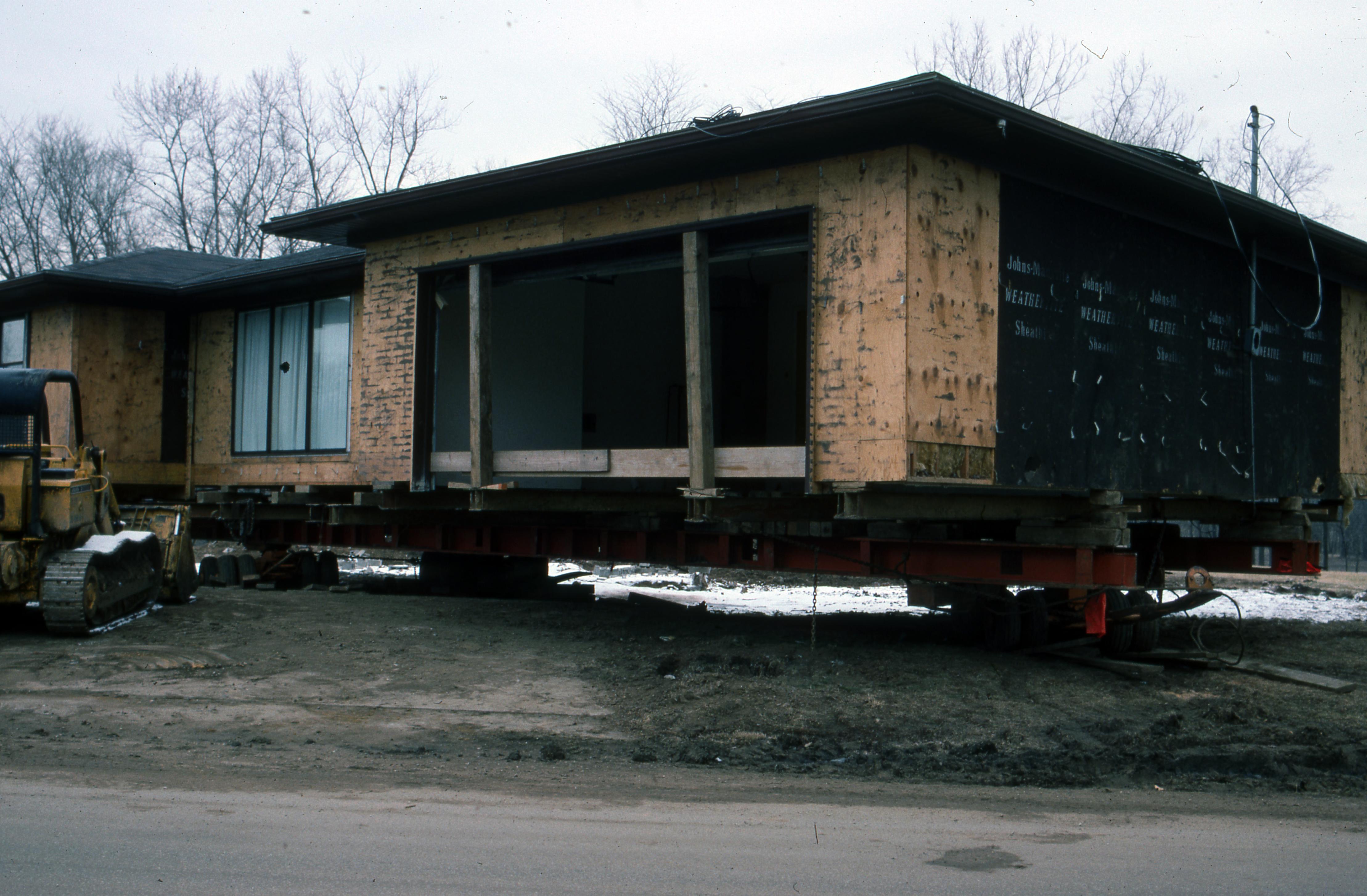 Bauer House: This house was originally located on the north side of North Street in town block 2 C/E. It was moved to the new location at 518 First Street before construction on the Atheneum had begun. Elmer Buchta Moving Engineers was contracted for this and many other building moves during the 1970s. This photo shows the house as it was being pulled off the old plat on Town Map Block 2 C/E. All the bricks were removed from the outer walls and were reapplied after the house was set on the new foundations at 518 First Street.