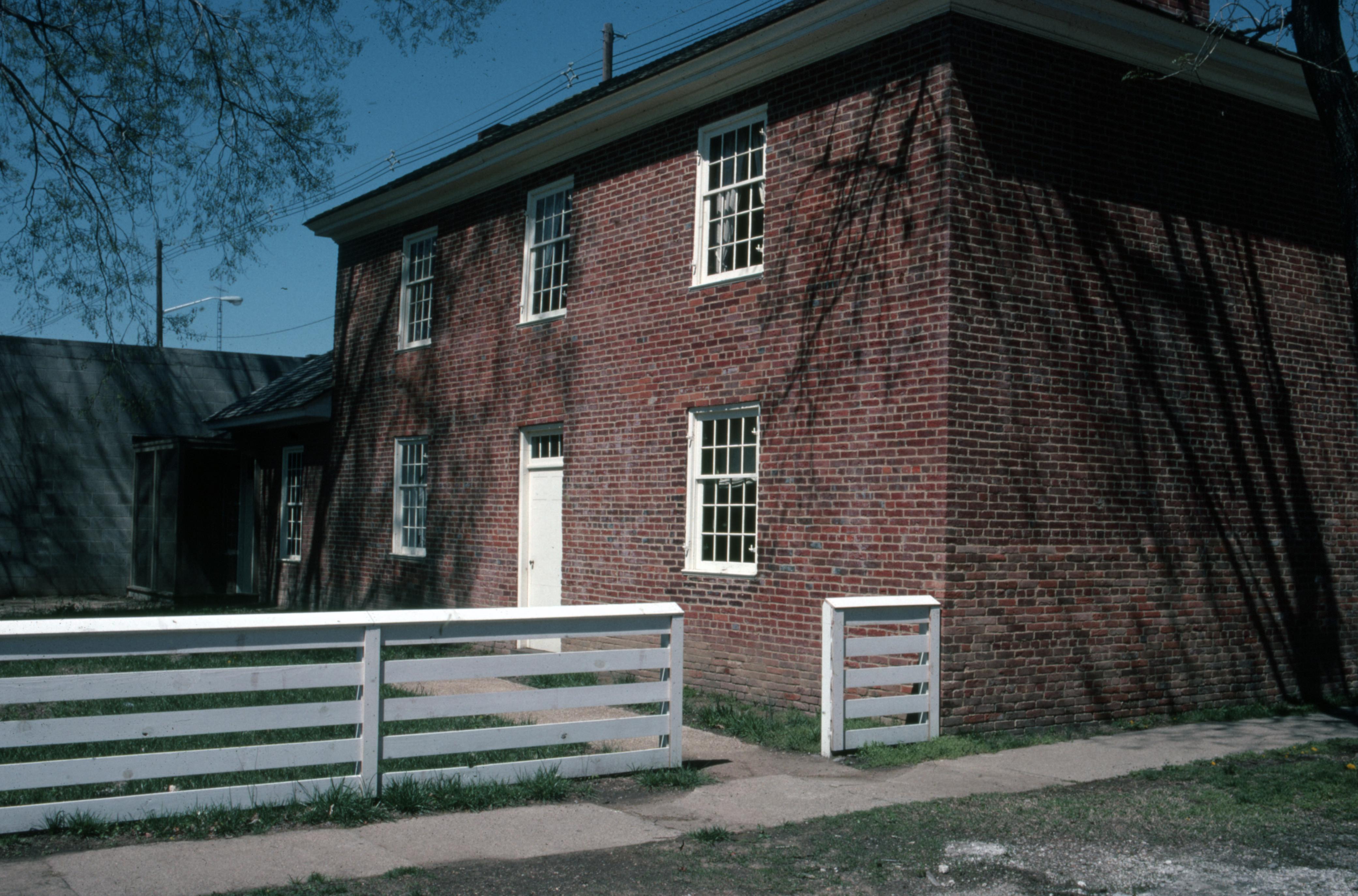 1830 Owen House: Located at 531 Tavern Street. This photo shows the 1830 Owen House west addition as it was under construction. The laundry building, New Harmony Speed Wash, just west of the Owen House, which can be seen on the far left of the photo, is also under construction.