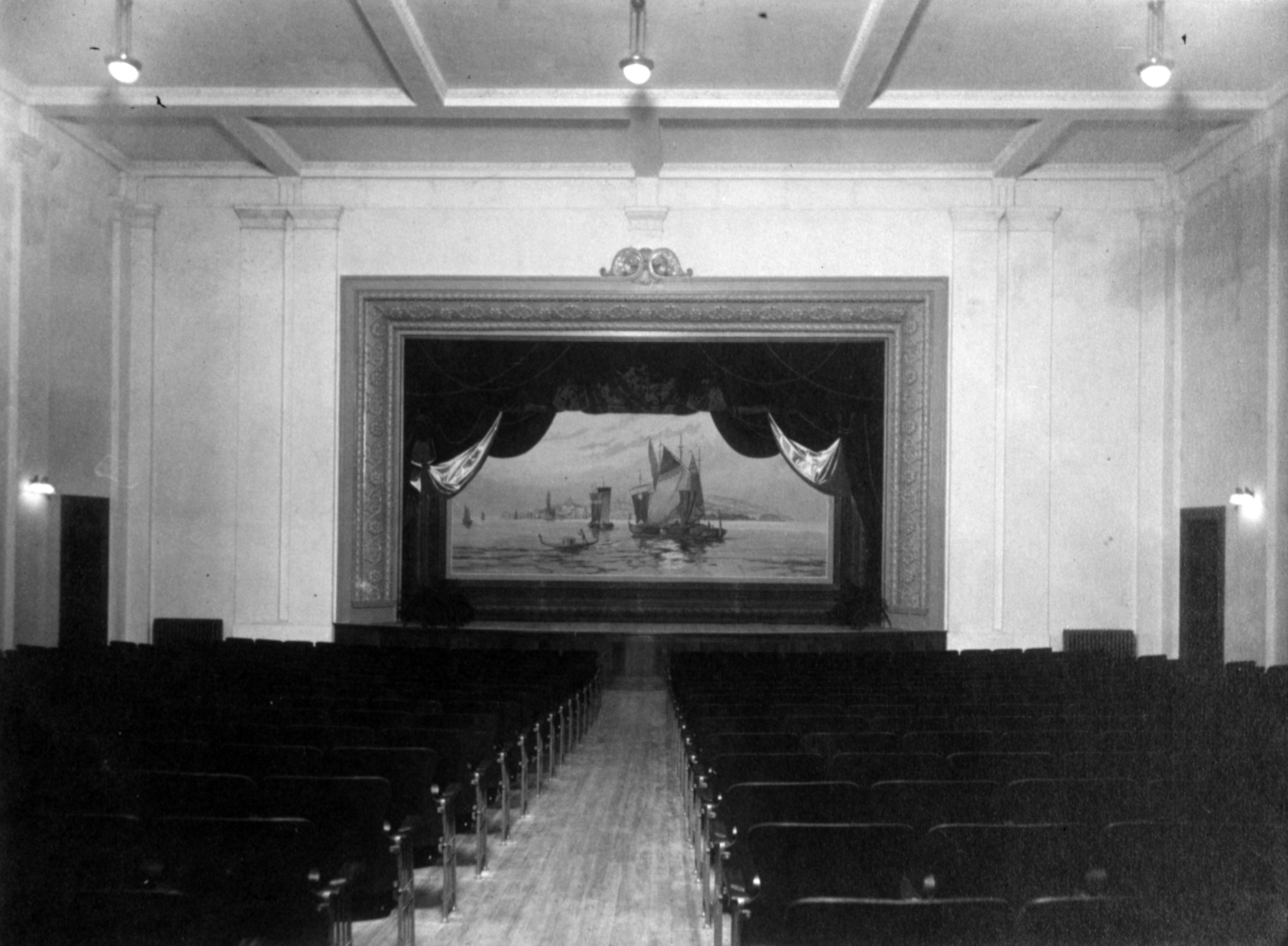 Murphy Auditorium: Murphy Auditorium is located at 419 Tavern Street and was constructed on the plat just east of the Working Men's Institute from 1911 to 1913, using the Doctor Edward Murphy Fund, and was built as part of New Harmony's centennial celebration of 1914. In 2014, the town's bicentennial, Murphy Auditorium became the new home of the concert series Under The Beams, originally housed in the Rapp-Owen Granary. Today, the auditorium is owned by the University of Southern Indiana and is the home of The New Harmony Theater with a seating capacity of 360 people. This is a historic photo of the stage area inside Murphy Auditorium. The Painting behind the stage is of an ancient harbor scene.