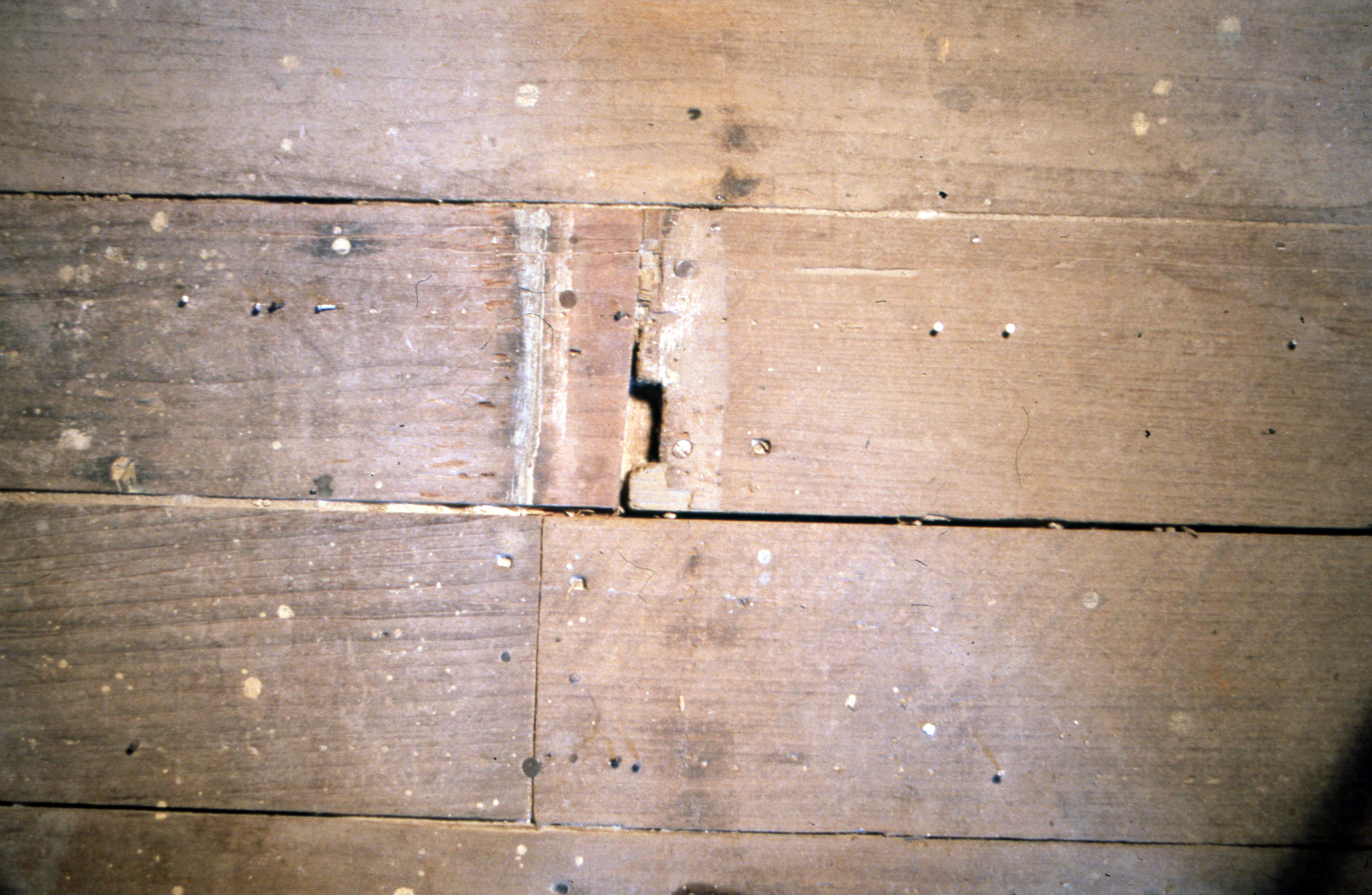 Schnee House: This photo is of the second Schnee home located at 603 West Street and was constructed in 1876. The first Schnee home was constructed during the Rappite occupation of the town, the Schnee brothers having moved to the town from the Quaker colony in Pennsylvania, and that house was located at 517 Tavern Street. The Gypsy Girl Livery Stable was later constructed behind that home. This photo shows the reuse or repurposing of wood applied to one of the floors.