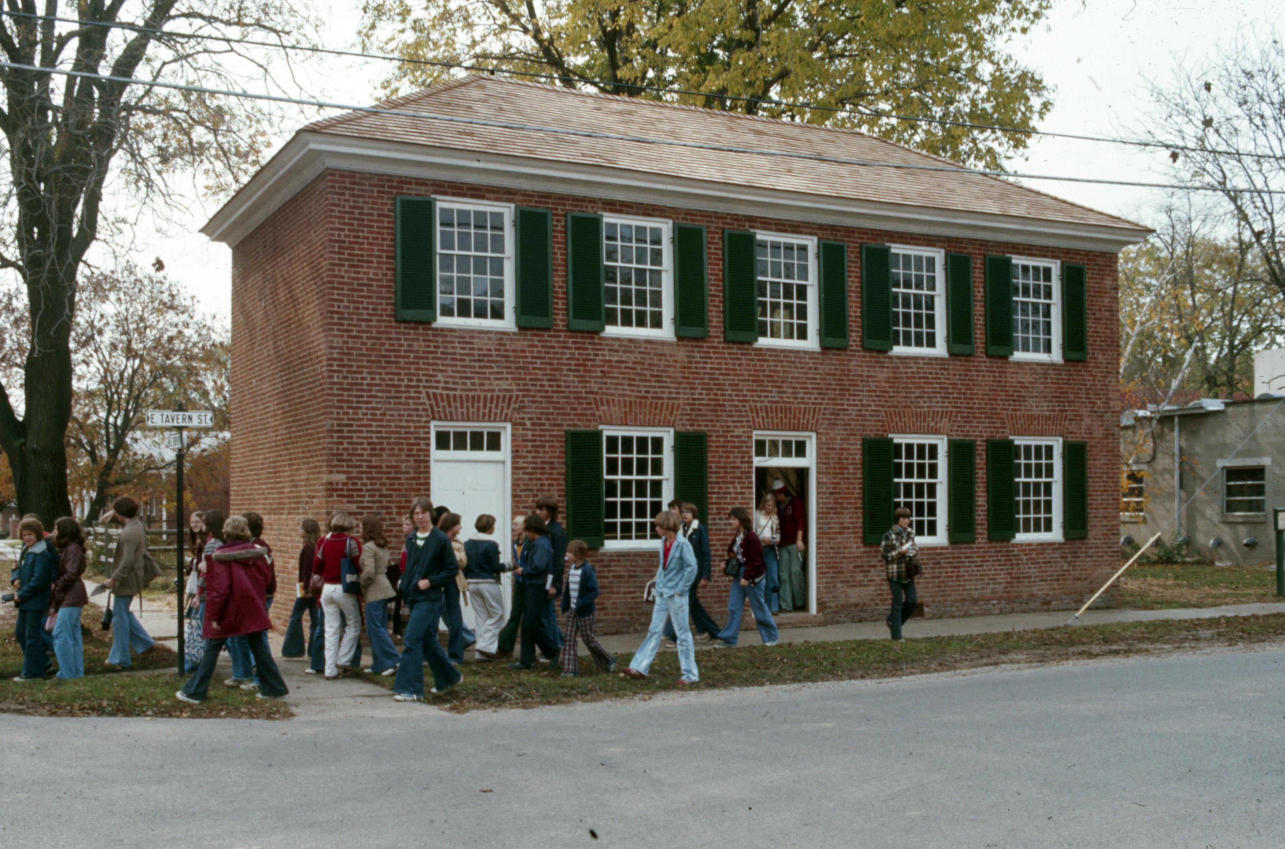 1830 Owen House: A group of tourists exiting the 1830 Owen house, located on at 531 Tavern Street. The photo was taken facing to the southwest on the corner of Tavern and Brewery Streets.