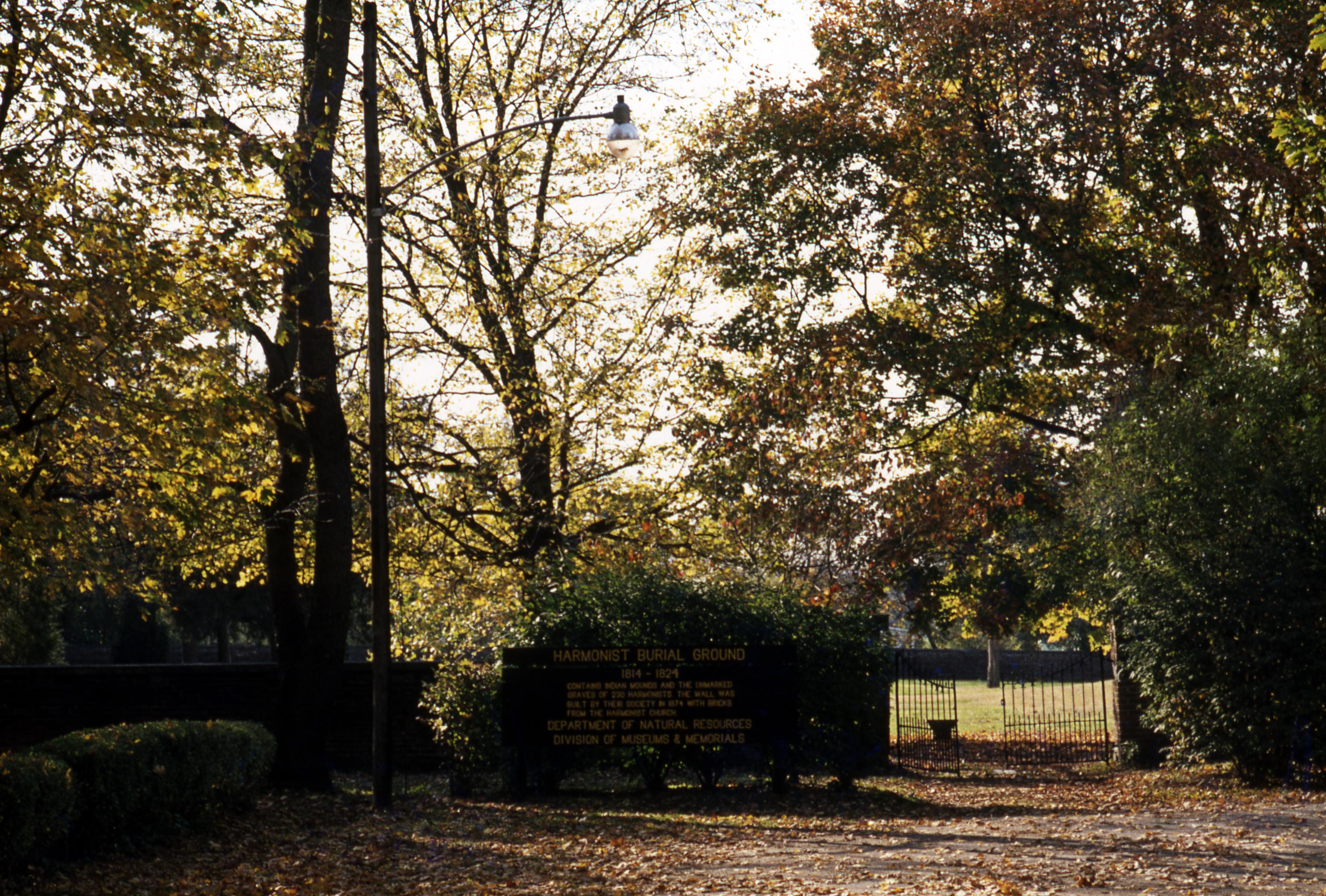 The Harmonist Cemetery located at the end of Granary and West Street. The cemetery was originally located in part of the Harmonist orchard and was fenced in with a brick wall in 1874. Located within the Harmonist walls are at least 20 Middle Woodland Period mounds most likely of the Hopewell people. The property is maintained by the Indiana State Museum and Historic Sites.