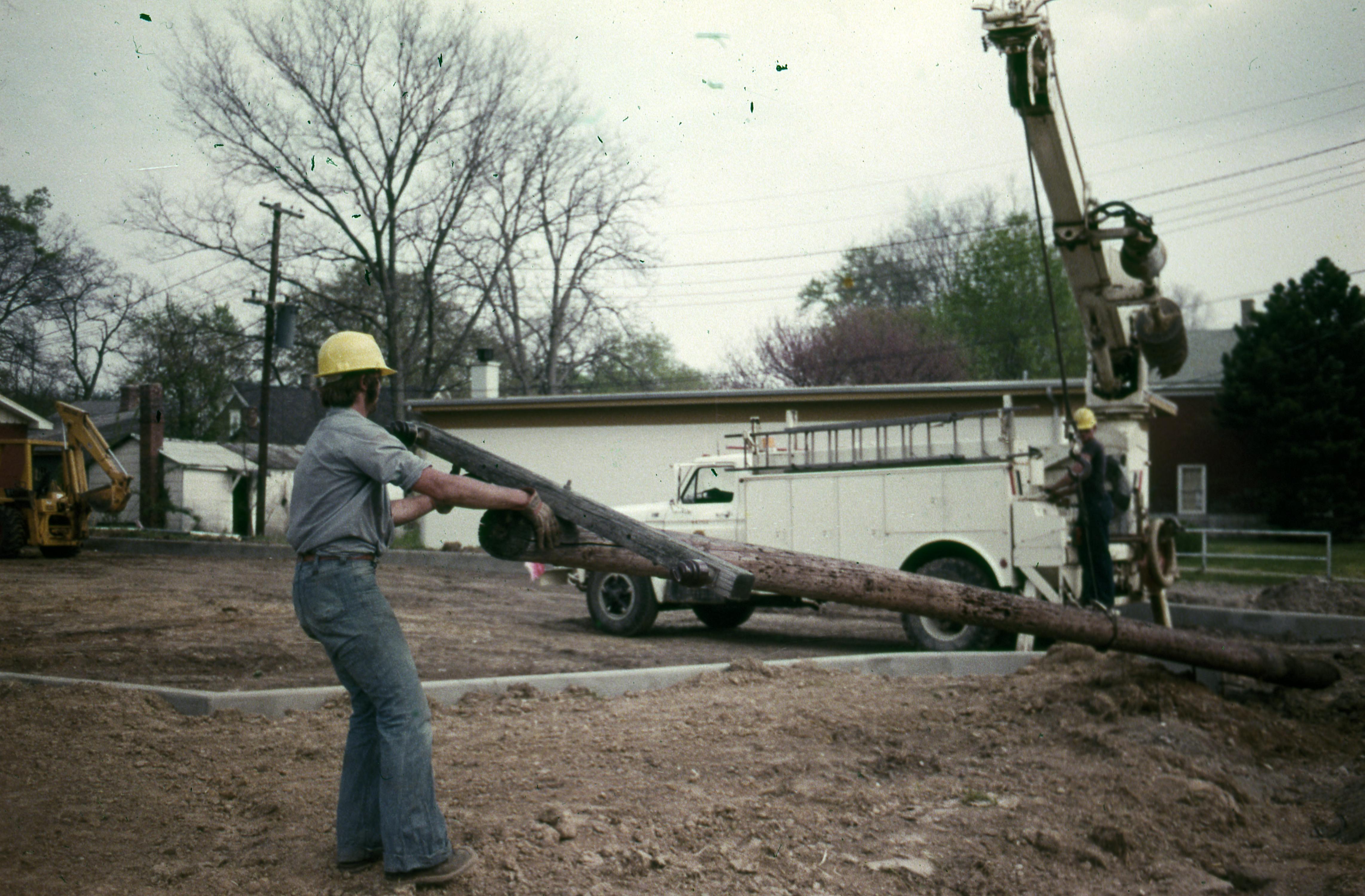Beal House: The Beal House was moved during the Lanark Construction, on Town Block 8 E/W on Main Street to 611 Church Street. The Beal house was constructed around 1829 by John Beal, who was a carpenter in the Owen and Maclure community. Beal constructed the house from lumber and timbers from an older horse barn. The new location would be the site of the Beal House and 1850s Doctor's Office (The Doctor's Office was a remodel of the Kemmerling House, which was also moved to this site). Elmer Buchta Moving Engineers was contracted for this and many other building moves during the 1970s. In this photo work crews are installing a new pole for power and phone lines. The long white building in the background is the old Indiana Bell Telephone Company's New Harmony office location.