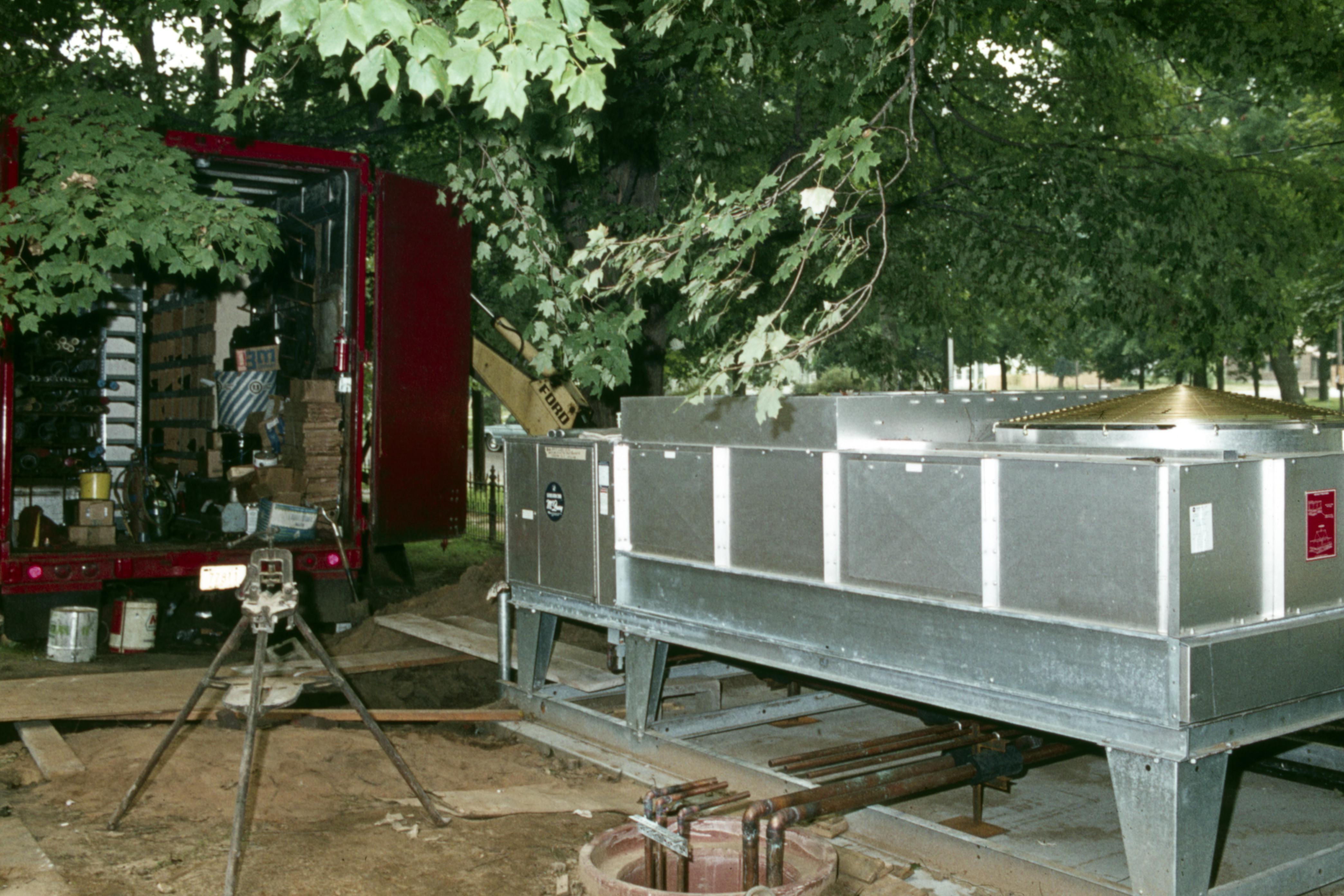 Murphy Auditorium: Murphy Auditorium is located at 419 Tavern Street and was constructed on the plat just east of the Working Men's Institute from 1911 to 1913, using the Doctor Edward Murphy Fund, and was built as part of New Harmony's centennial celebration of 1914. In 2014, the town's bicentennial, Murphy Auditorium became the new home of the concert series Under The Beams, originally housed in the Rapp-Owen Granary. Today, the auditorium is owned by the University of Southern Indiana and is the home of The New Harmony Theater with a seating capacity of 360 people. Equipment, and a central air unit, sitting in front of the Murphy Auditorium while the building was undergoing refurbishment.