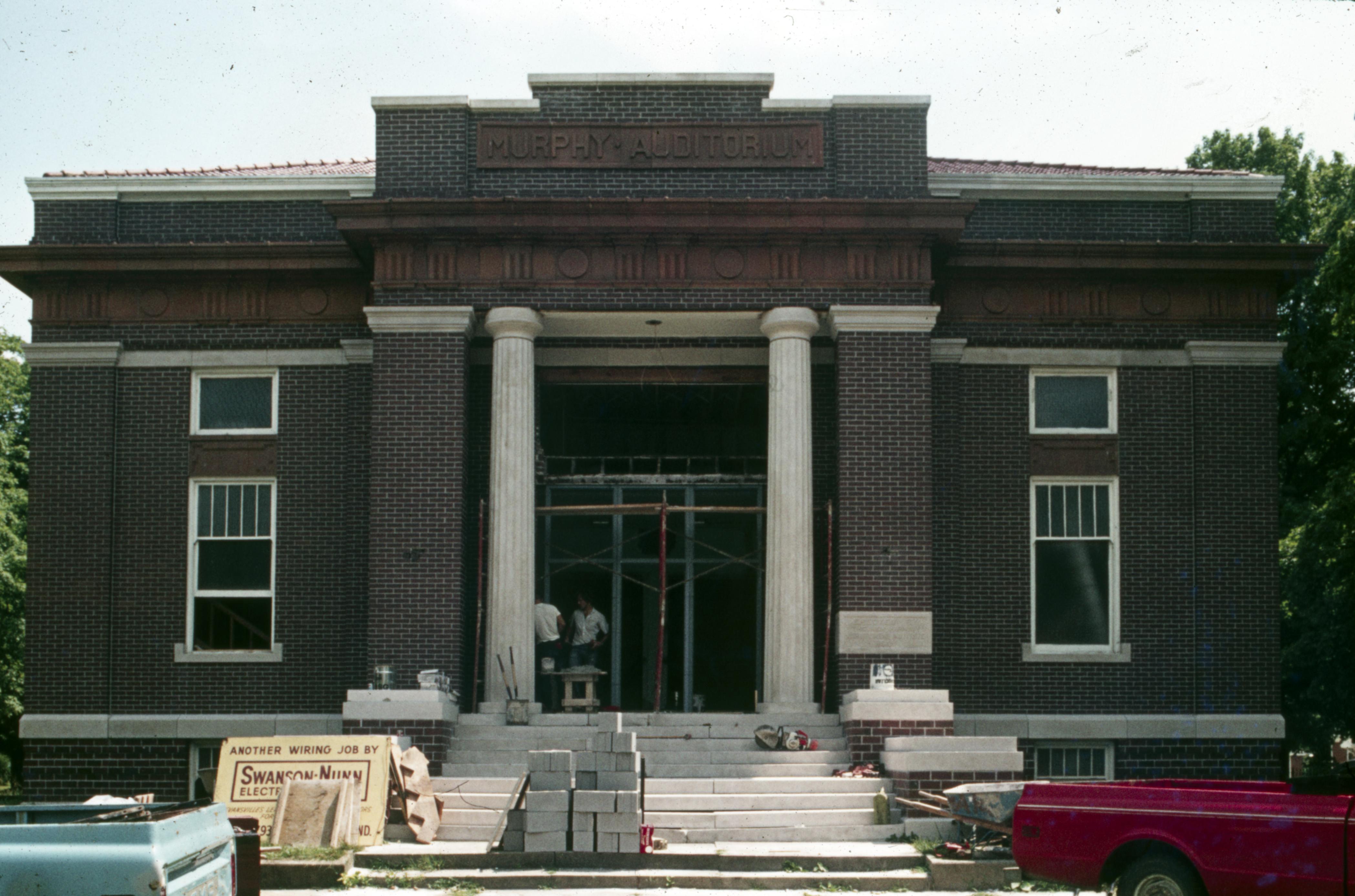 Murphy Auditorium: Murphy Auditorium is located at 419 Tavern Street and was constructed on the plat just east of the Working Men's Institute from 1911 to 1913, using the Doctor Edward Murphy Fund, and was built as part of New Harmony's centennial celebration of 1914. In 2014, the town's bicentennial, Murphy Auditorium became the new home of the concert series Under The Beams, originally housed in the Rapp-Owen Granary. Today, the auditorium is owned by the University of Southern Indiana and is the home of The New Harmony Theater with a seating capacity of 360 people. This is a front view of the building, the north side, facing Tavern Street. The sign on the left side of the photo indicates the wiring was completed by Swanson-Nunn electrical company.