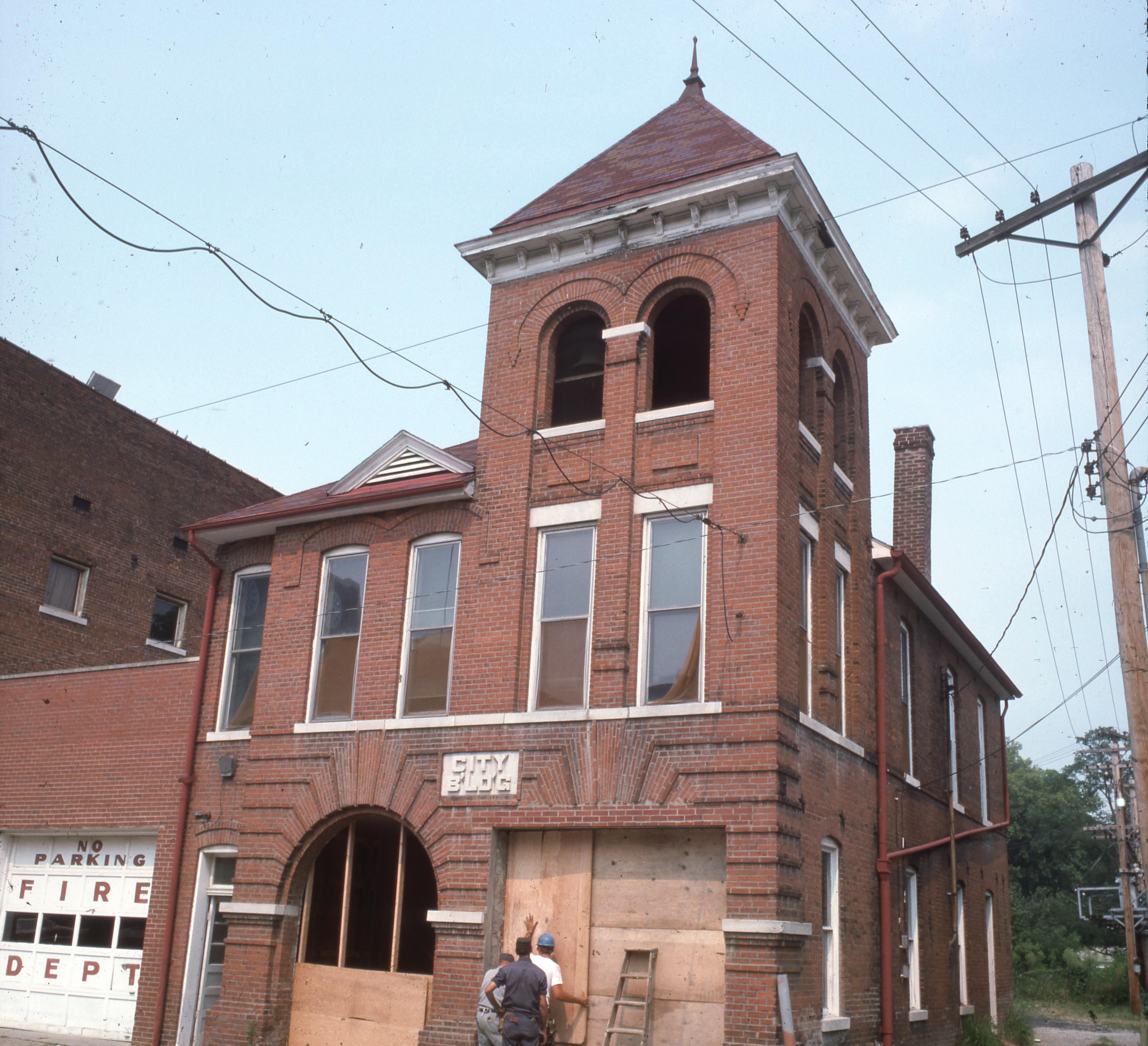 The City Building: This building is Located at 608 Main Street and housed the firehouse on the ground floor and City Hall on the second floor. This photo shows three construction workers blocking off the two firehouse entrances before reconstruction work began.