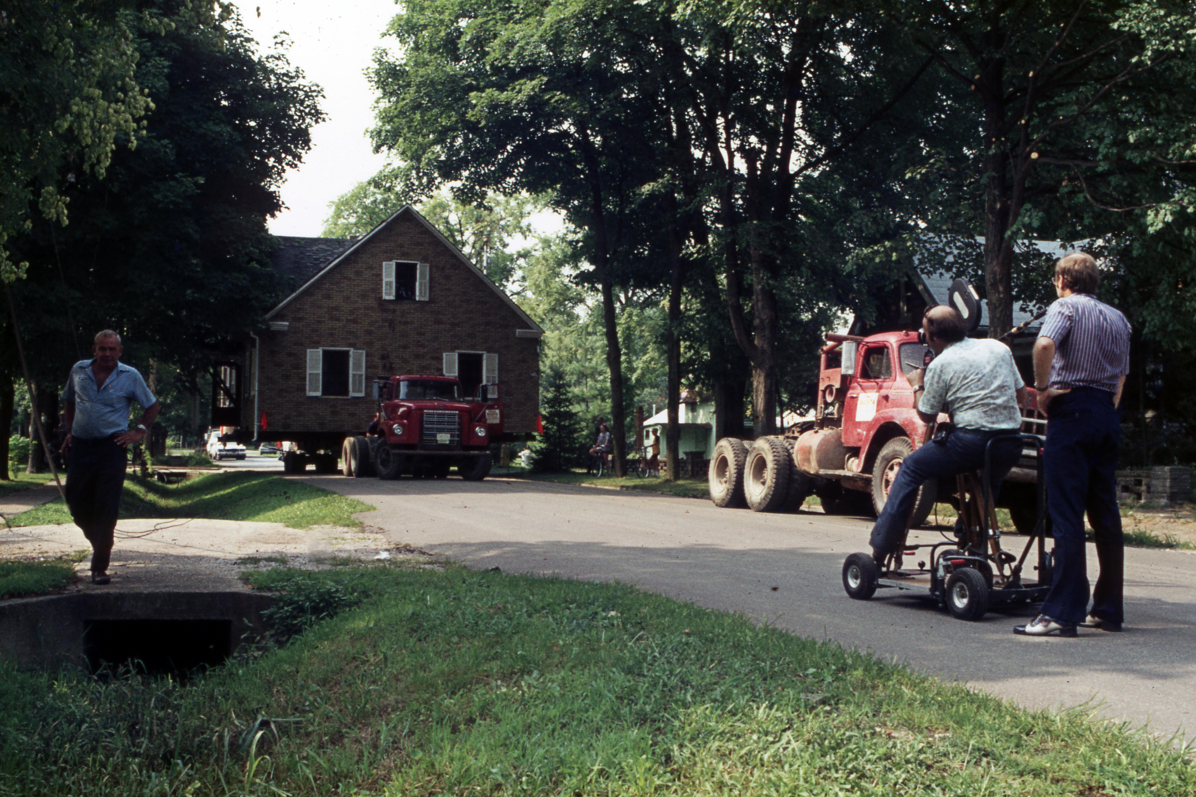 Beal House: The Beal House was moved during the Lanark Construction, on Town Block 8 E/W on Main Street to 611 Church Street. The Beal house was constructed around 1829 by John Beal, who was a carpenter in the Owen and Maclure community. Beal constructed the house from lumber and timbers from an older horse barn. The new location would be the site of the Beal House and 1850s Doctor's Office (The Doctor's Office was a remodel of the Kemmerling House, which was also moved to this site). Elmer Buchta Moving Engineers was contracted for this and many other building moves during the 1970s. In this photo the house is headed north on Brewery Street toward the new plat on Church Street. At this point it was in front of the house at 815 Brewery.