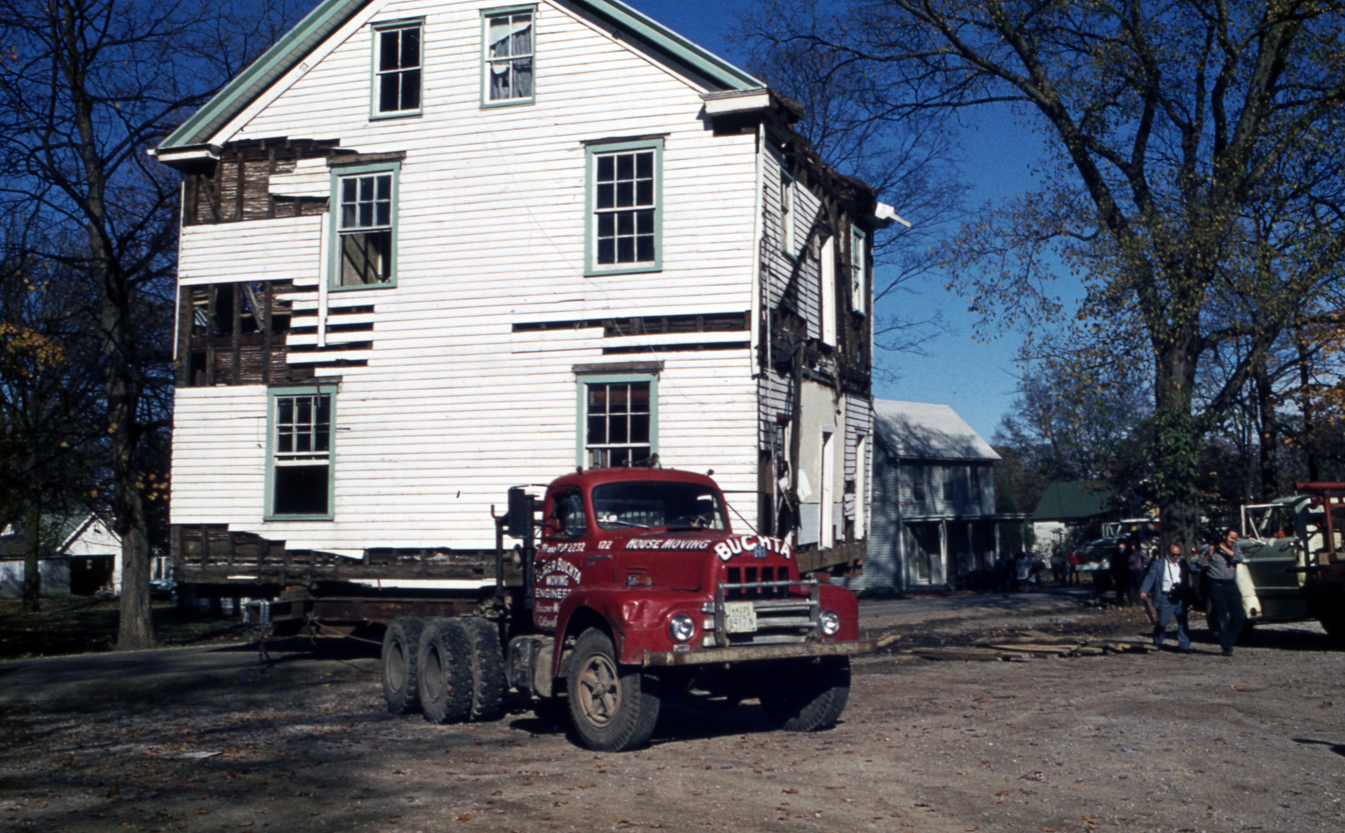 Golden House: This building was moved from the plat of 807 Church, what is now 811 Church Street, to one plat west of 723 E. Church Street but has since been demolished, most likely when the house at 707 E. Church was built in 2009. Elmer Buchta Moving Engineers was contracted for this and many other building moves during the 1970s. This shows the house being backed out onto the street in the process of being moved to the new location one block west.
