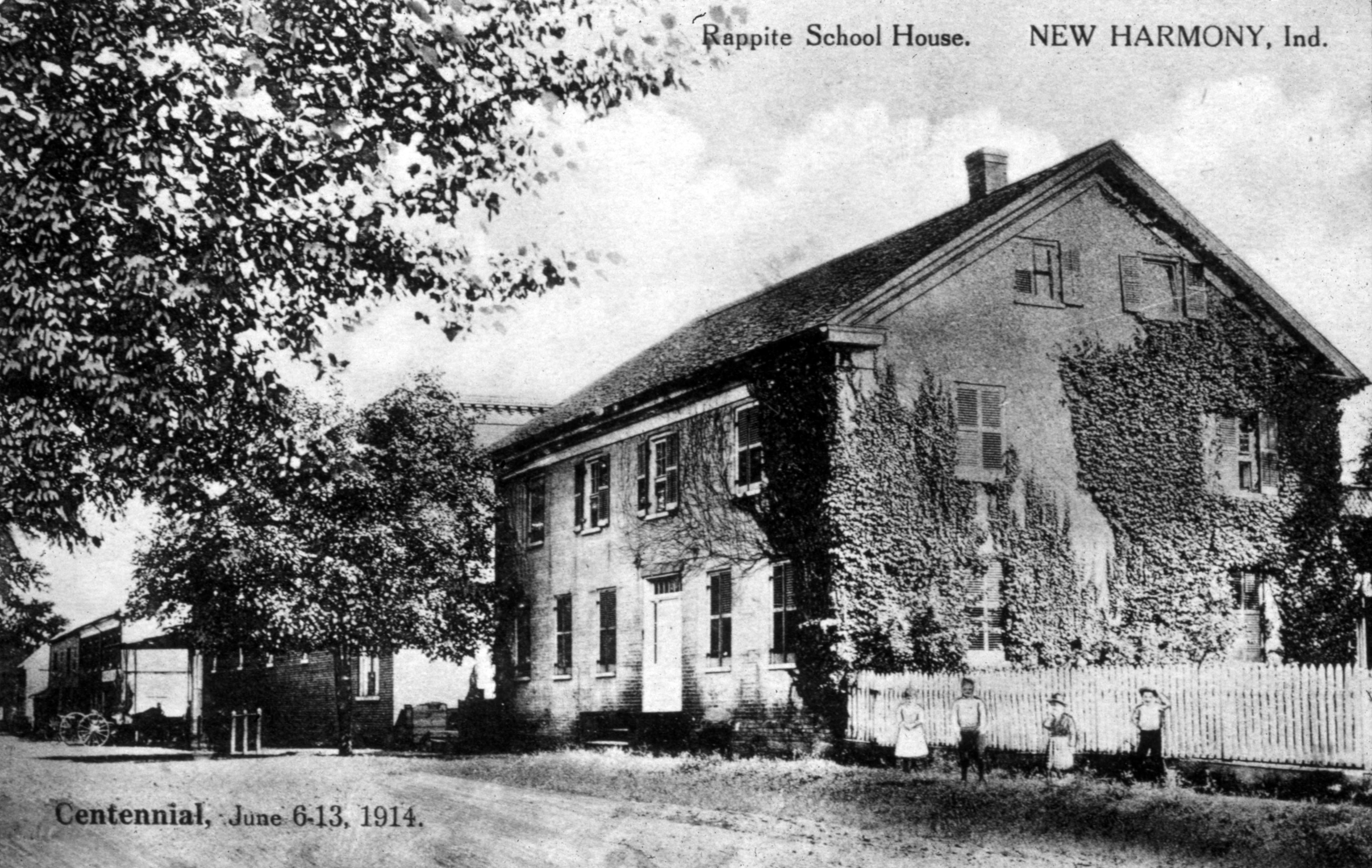 School House: This building was established from the remodeled Rappite/Harmonist church in 1874 see MSS 247-5130. It stood where Church Park is now located at the corner of Church and West Streets. This photo is photographic postcard, and was fabricated with parts of several photographs put together, which sometimes occurred with these types of small town cards. This one was made for the town's centennial celebration in 1914. The old school was torn down during this time and a new building erected in its place using the old stone door arch. During the late 1970s the second building was demolished and a new school was constructed at 1000 East Street, which was closed completely in 2012. The original stone arch was incorporated into the new Church Park constructed on the original church and school site.