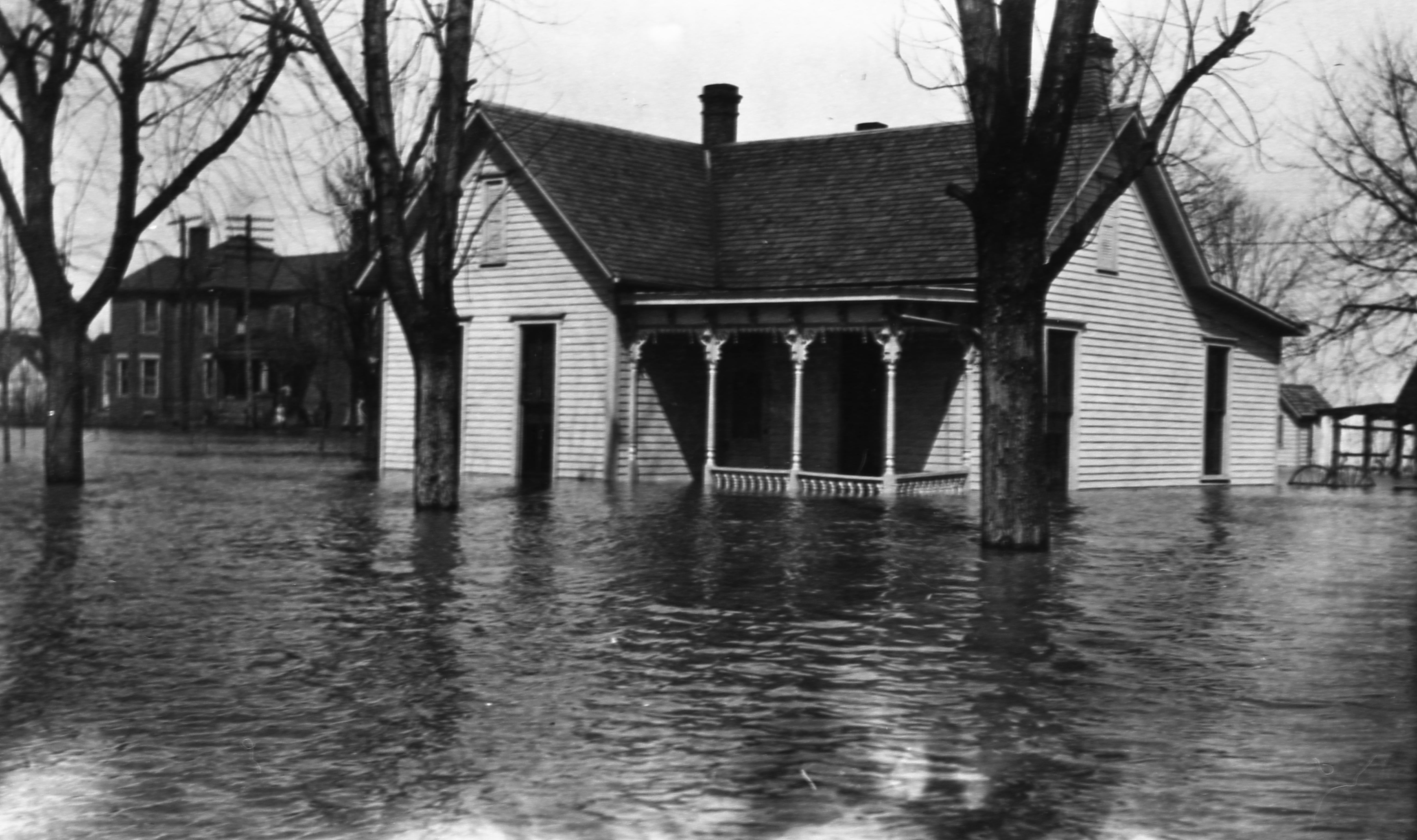 Transparencies and Negatives Collection: Historic photographs. 1913 Flood: On March 24 and 25 of 1913 the Wabash River had produced a large flood, which inundated the town of New Harmony, from torrential rains and storms which had also produced tornados across the mid-west United States. At its height it measured 27 feet 10 inches. Raintree Street, facing north, near Maclure�s Park. Note Johnson Methodist Church in the background.