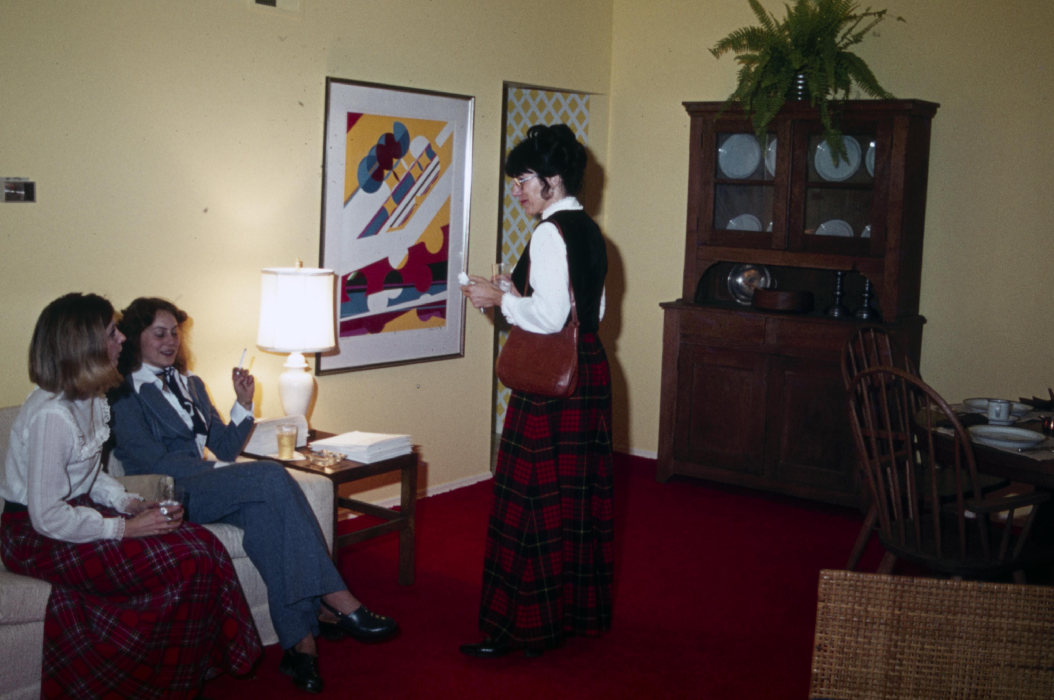 Lanark Development Collection: Construction of 820 Main Street New Harmony Indiana. Finished room interior. Yellow walls, red carpet, antique hutch. People viewing the open house.