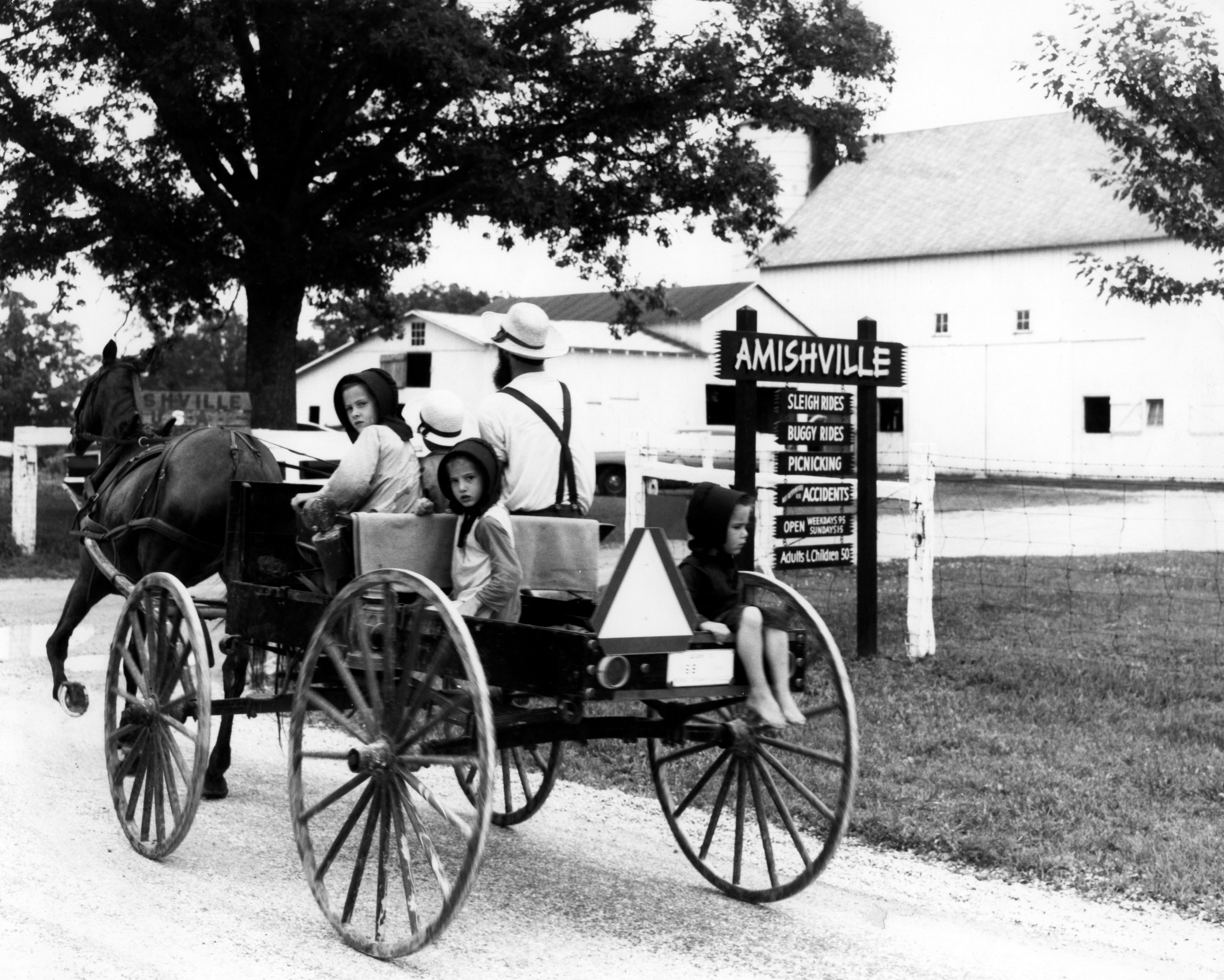The date of this photograph is unknown, but as of 2021, Amishville USA is a campground, not an amusement. It is near the Wabash River, in an area with a large Amish population.
