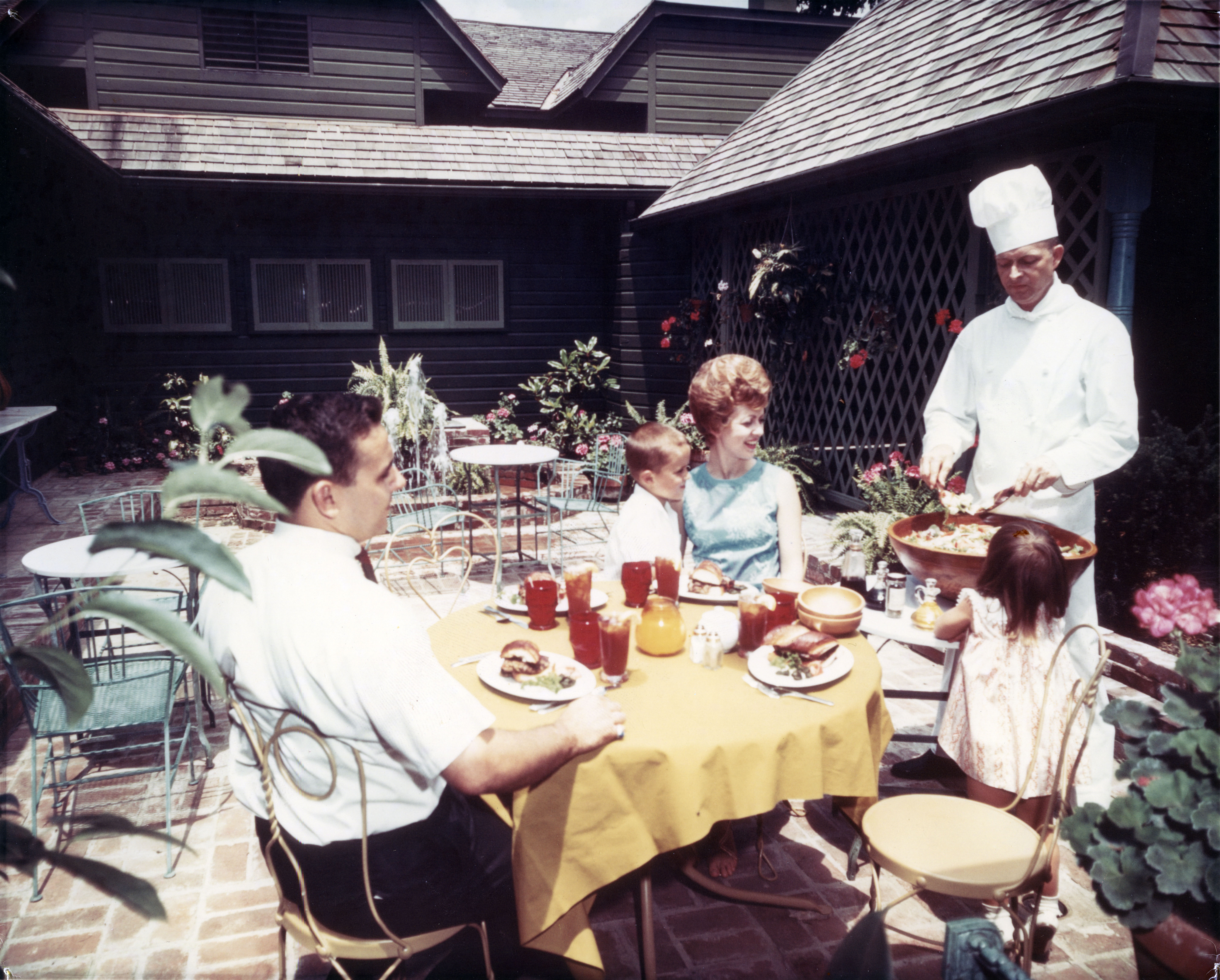 Family watching a chef on the patio at the Red Geranium restaurant.