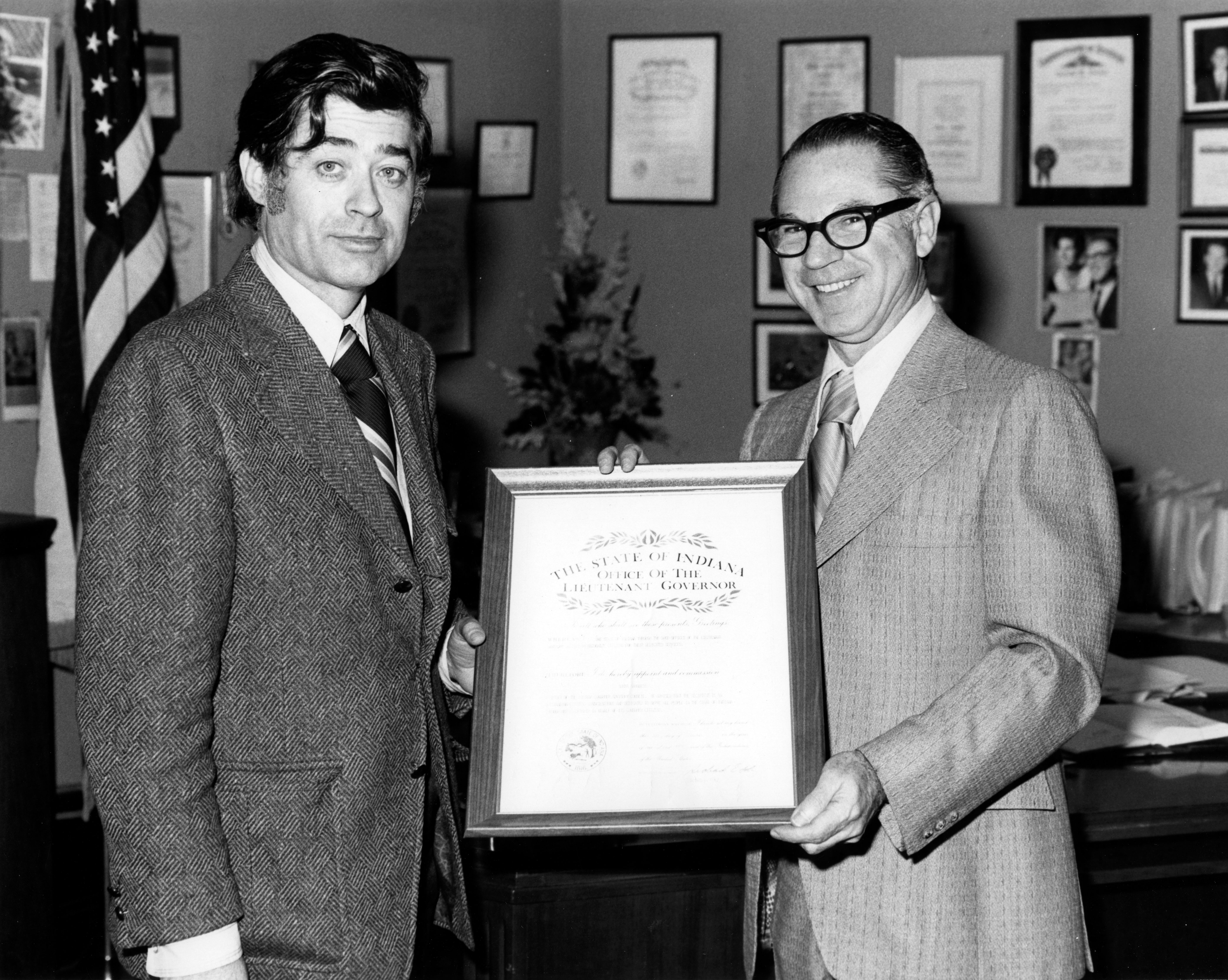 Basil Kafiris and Sidney S. Kramer (1912-2007). Kafiris' name was found as the author of a number of books about economics in Indiana. The document being held is from the Lt. Gov. of Indiana, but its content cannot be read.