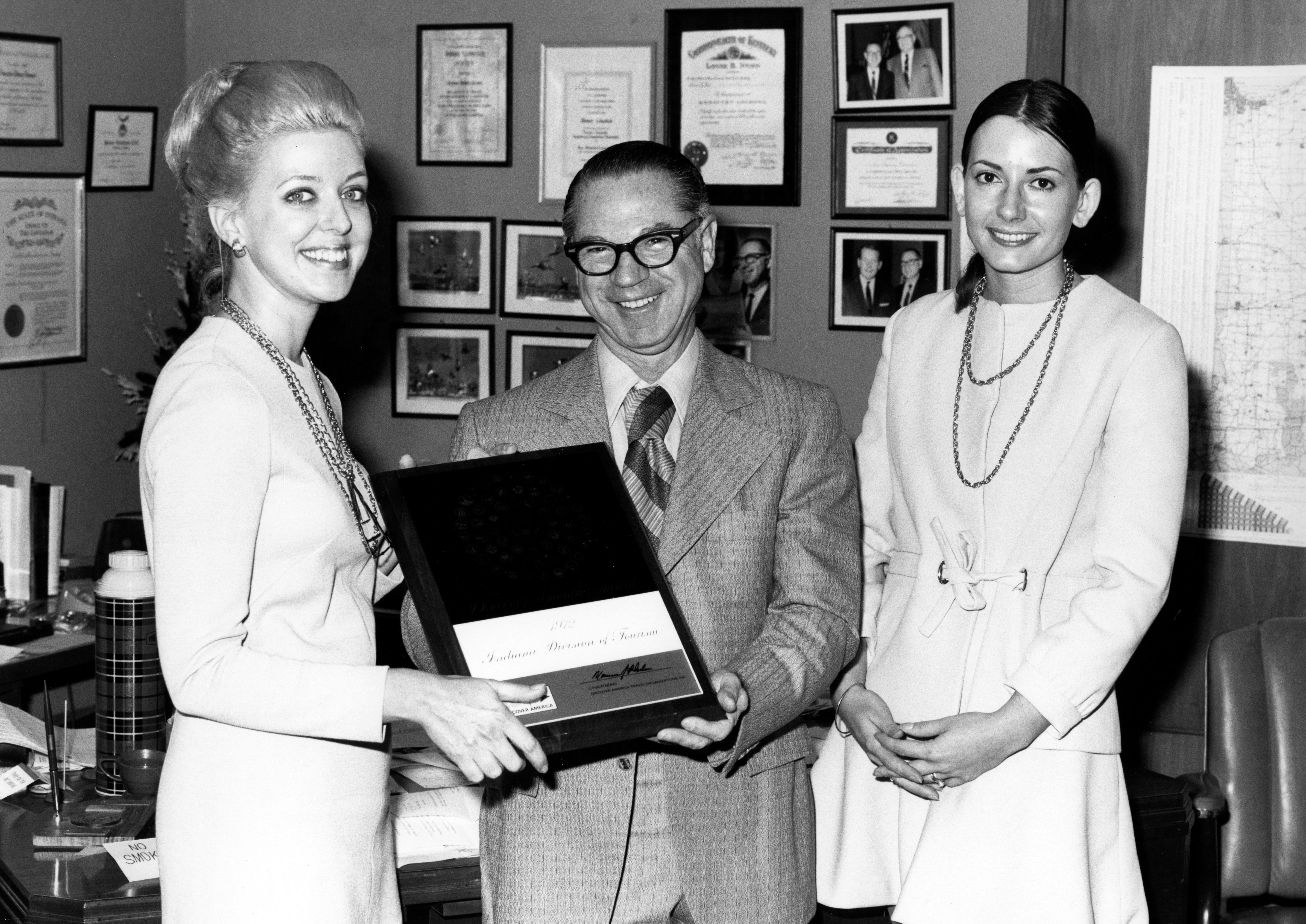 Sidney S. Kramer (1912-2007) flanked by two unidentified women. The plaque is from the Indiana Division of Tourism.