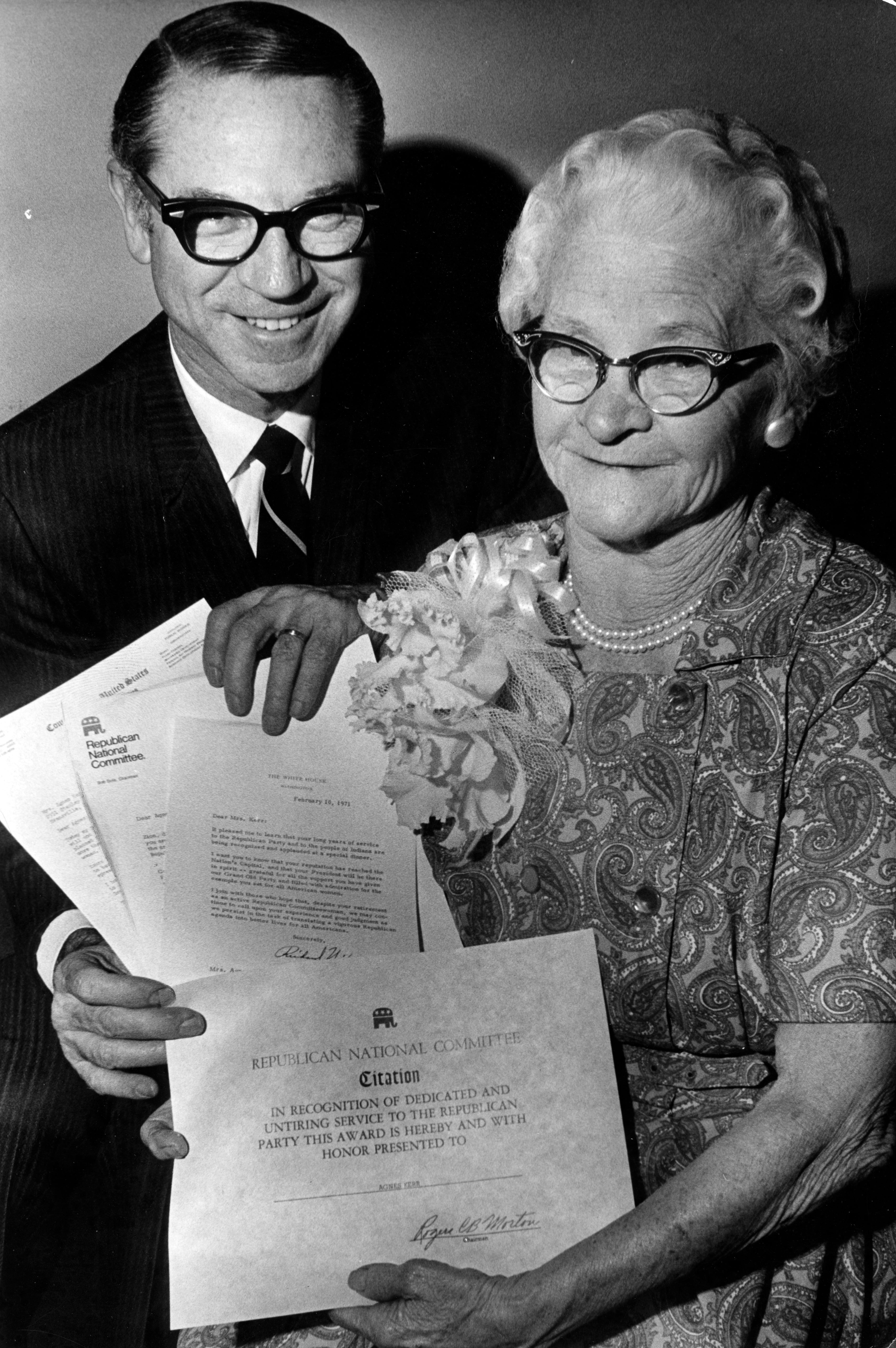 Sidney S. Kramer (1912-2007) with Mrs. Agnes Kerr (1884-1977), with a citation recognizing her contributions to the Republican party. Her obituary says she was a GOP precinct committeewoman for over 40 years.