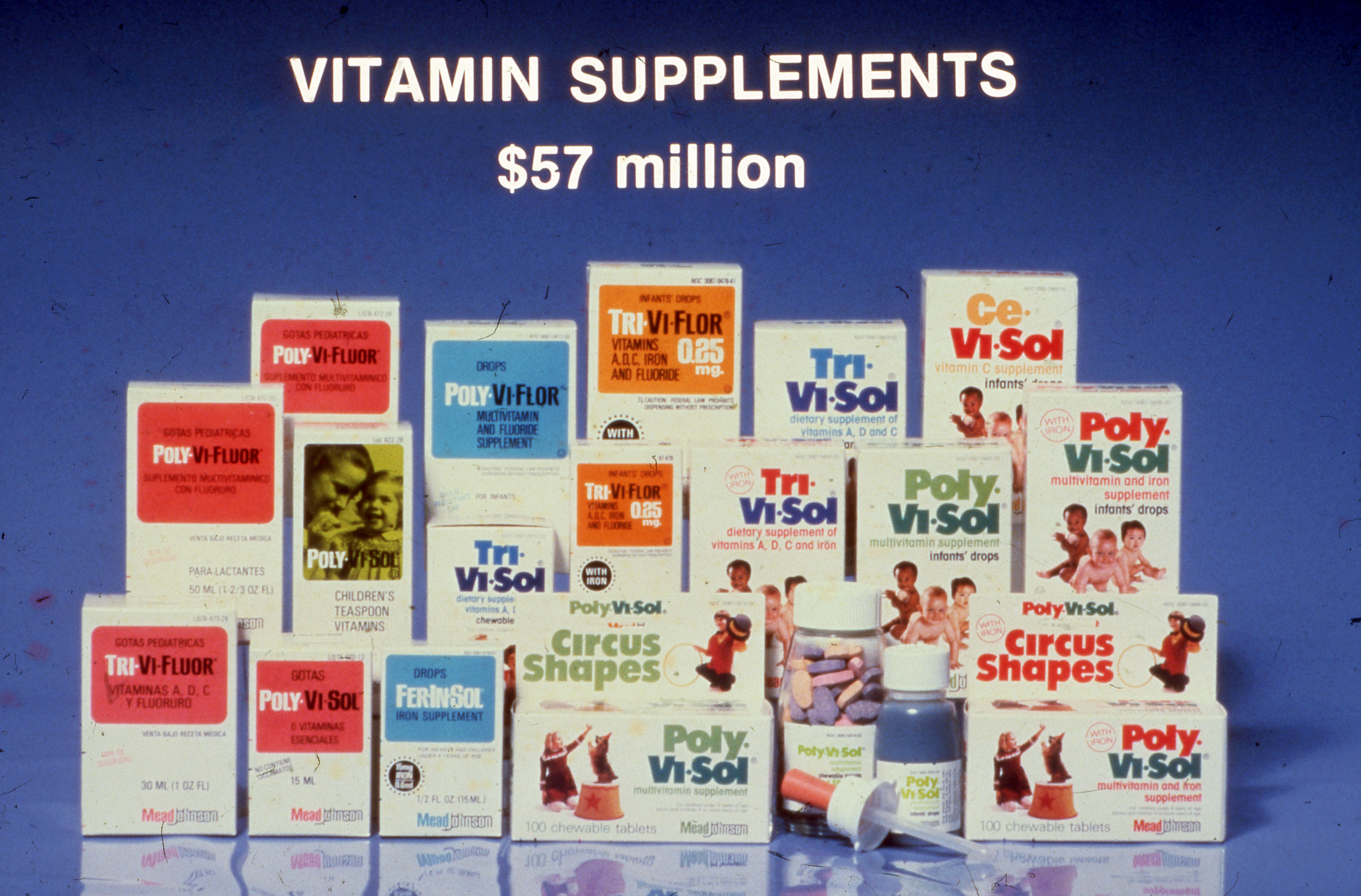 Business presentation of boxes of various Mead Johnson vitamin supplements under the heading "Vitamin Supplements $57 million."