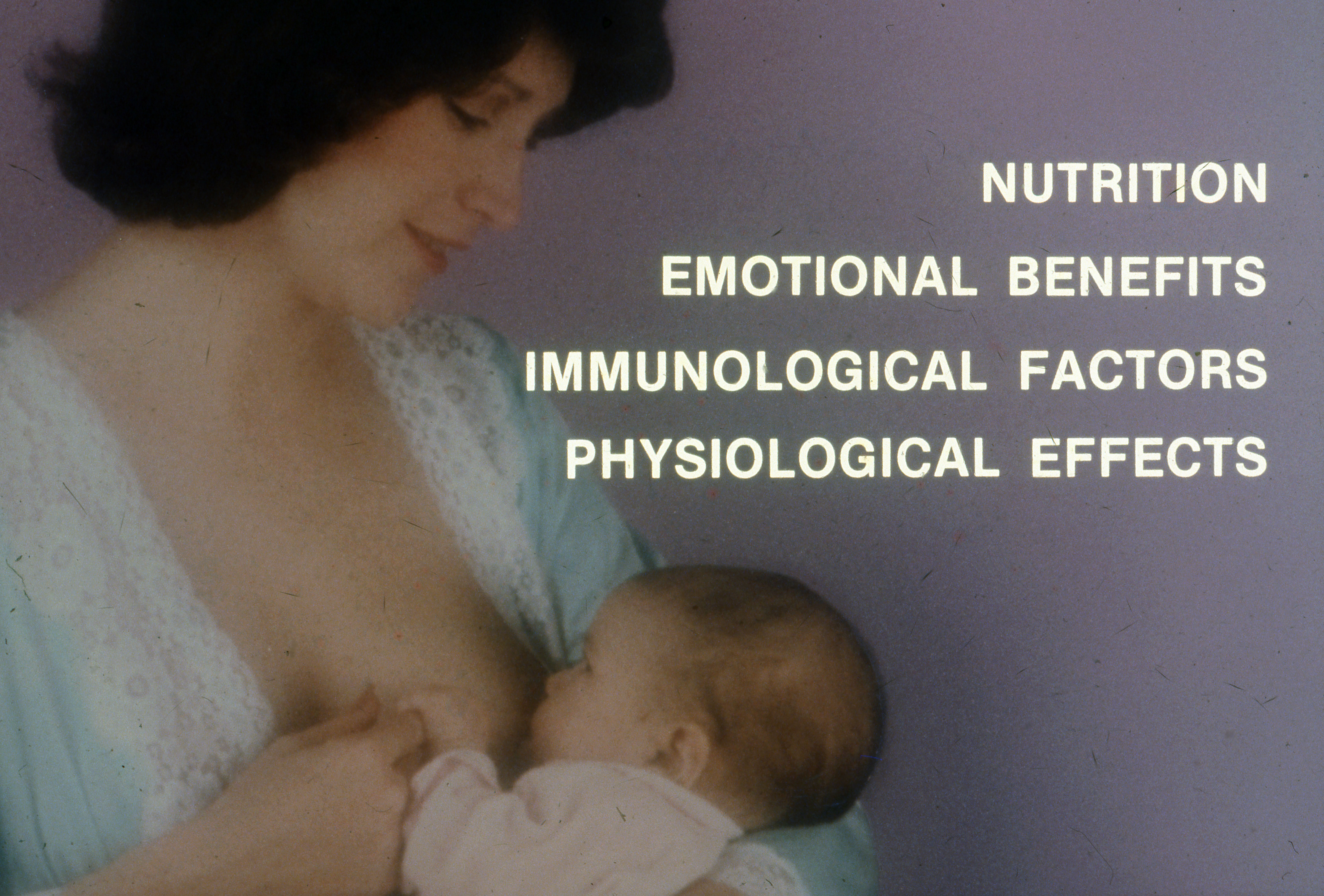 Business presentation of a woman nursing her baby with the words "Nutrition Emotional Benefits Immunological Factors Physiological Effects"
