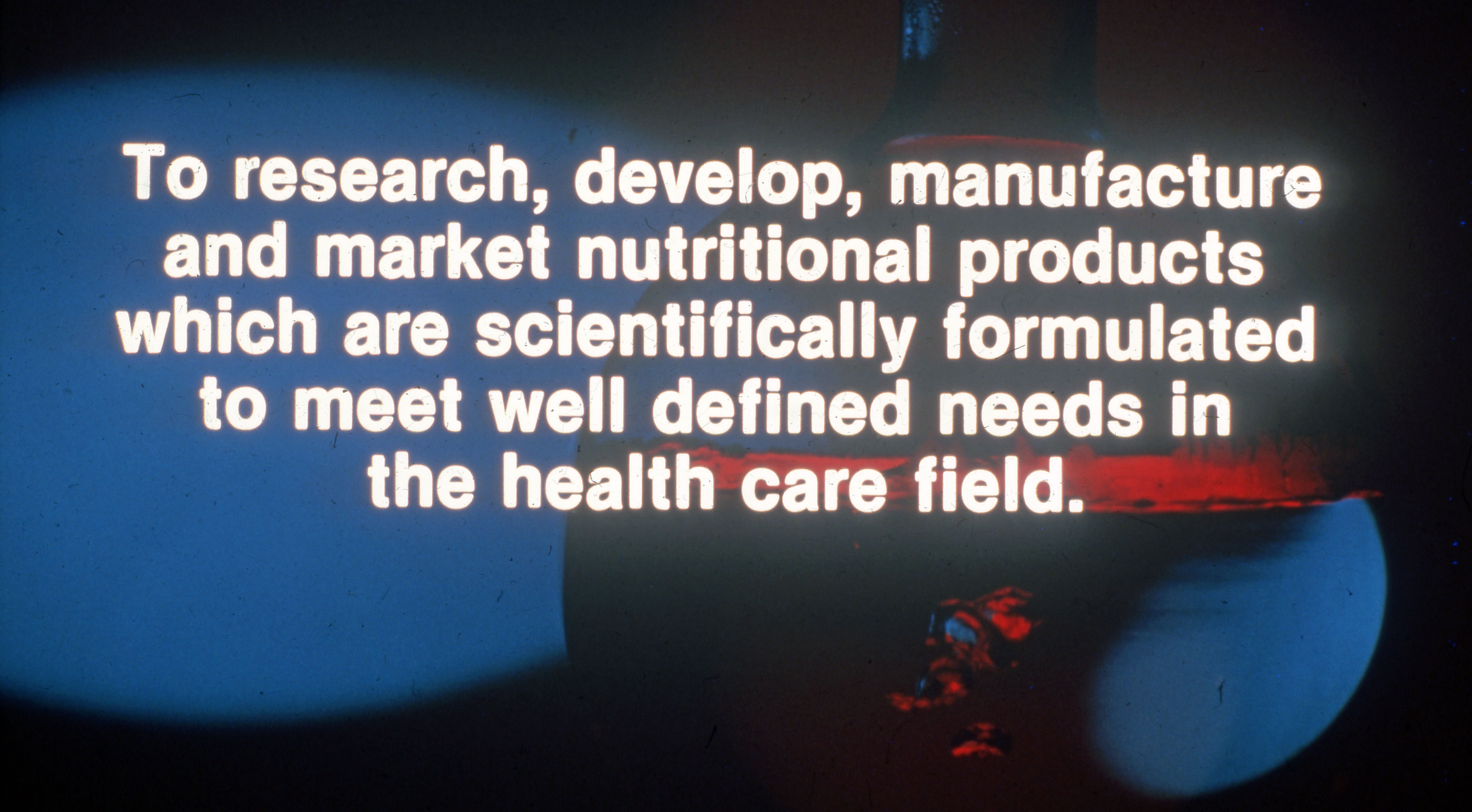 Business presentation of the words, "To research, develop, manufacture and market nutritional products which are scientifically formulated to meet well defined needs in the health care field."