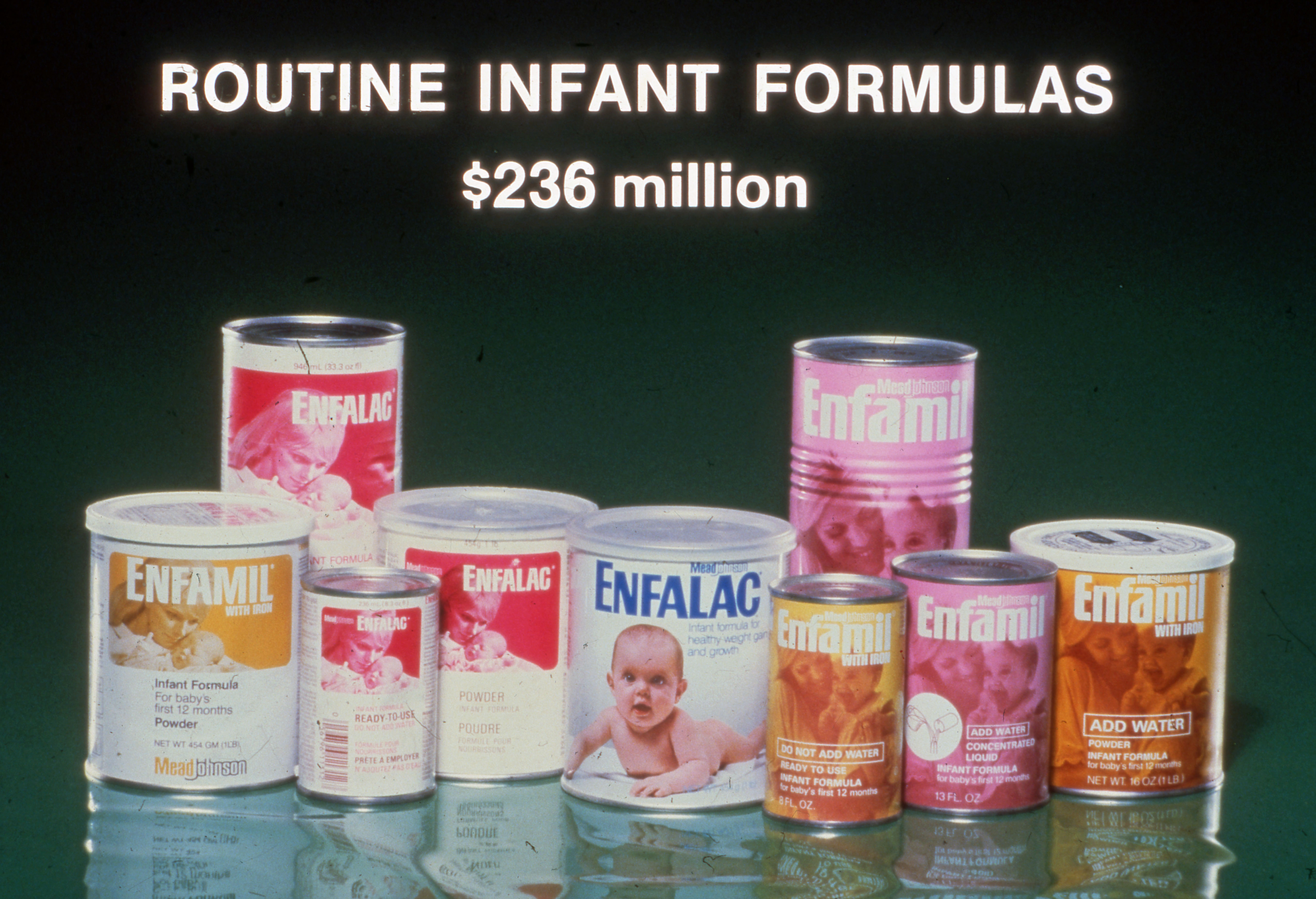 Business presentation of cans of Enfamil and Enfalac, with the words "Routine Infant Formulas $236 million"