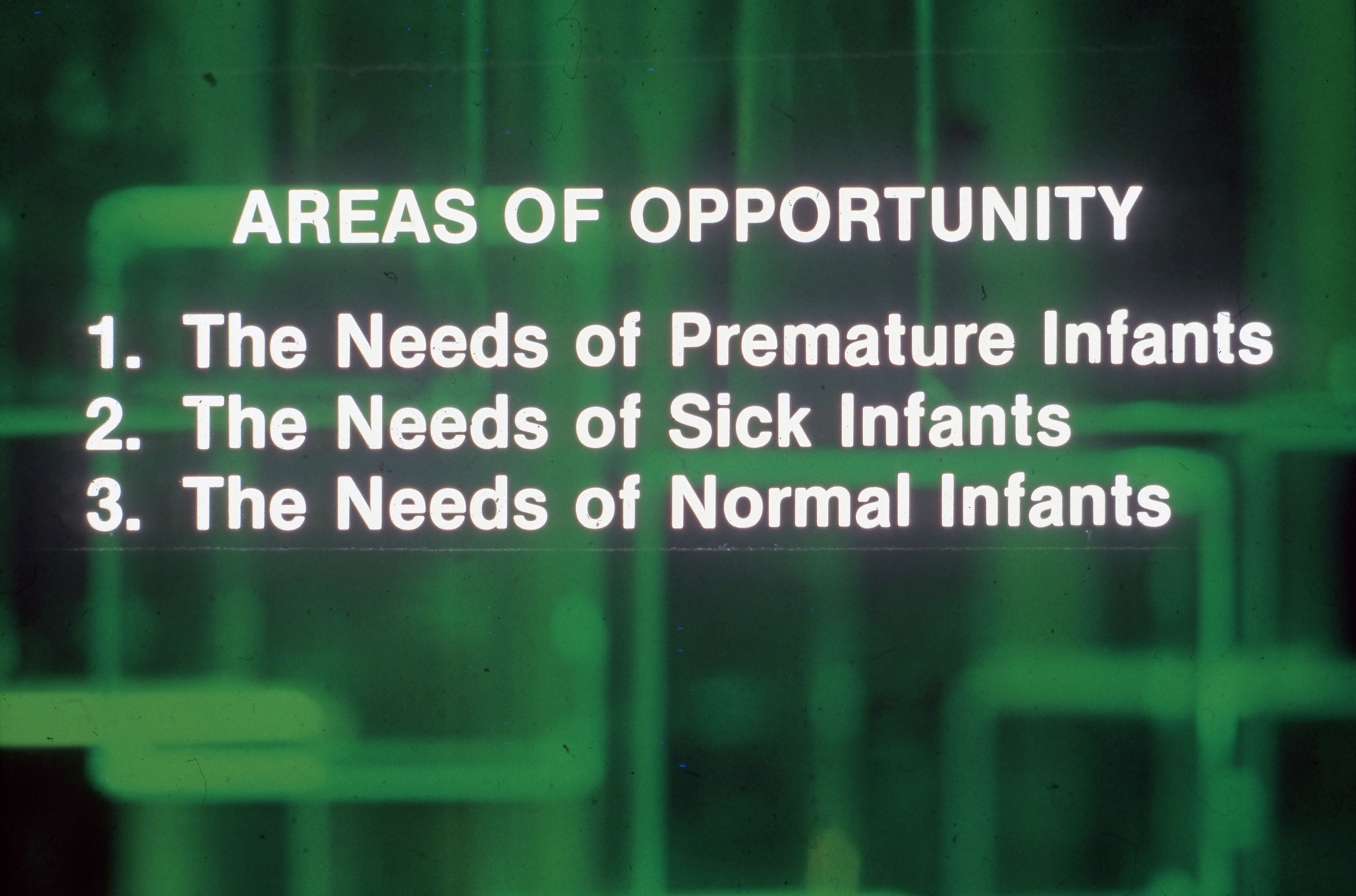 Business presentation with the words "Areas of Opportunity 1. The Needs of Premature Infants 2. The Needs of Sick Infants 3. The Needs of Normal Infants"