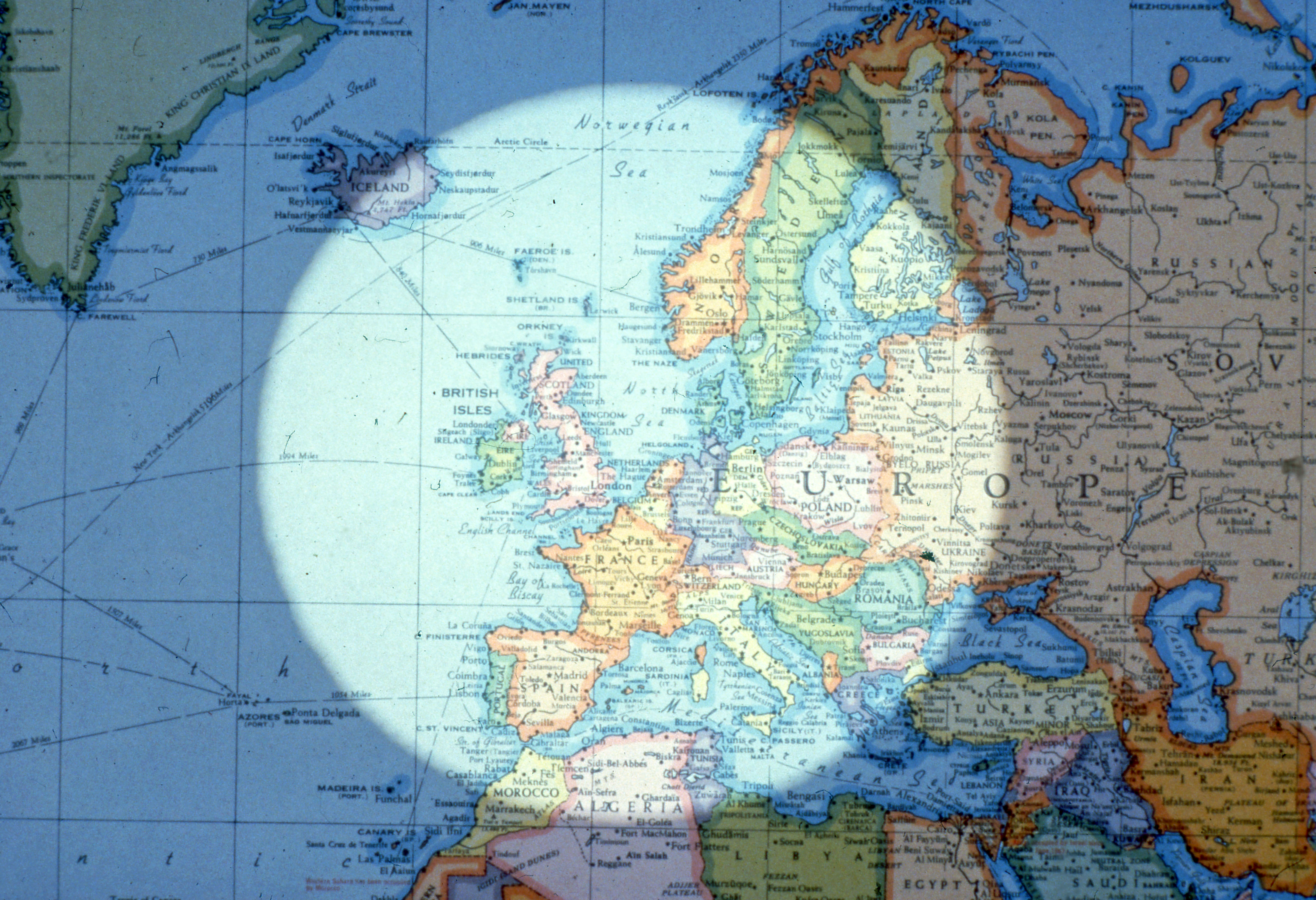 Map of the world with Iceland, Europe, Scandinavia, and a portion of northern Africa highlighted in Evansville, Indiana