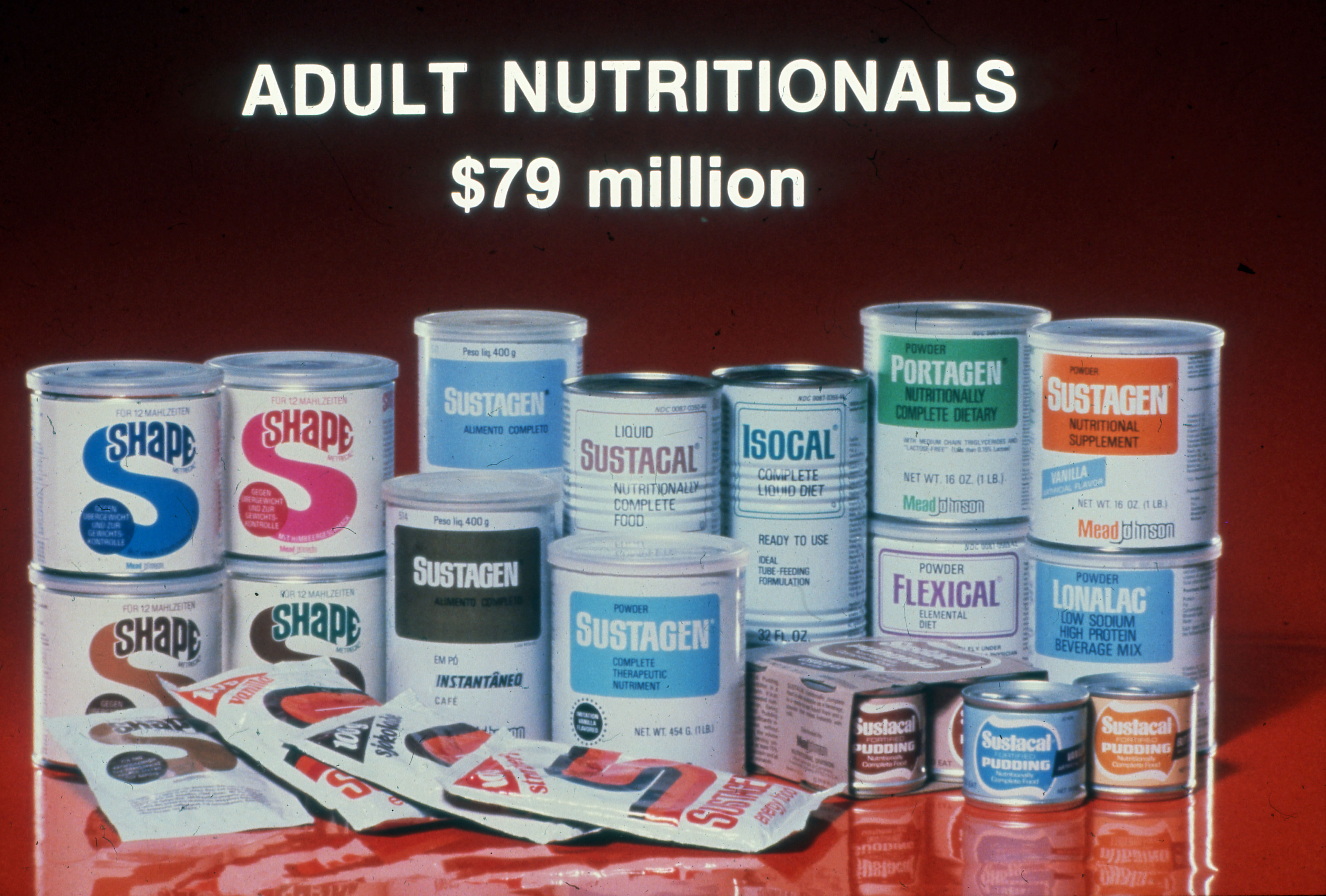 Business presentation of Shape, Sustagen, Sustacal, Isocal, Flexical, Portagen, and Lonalac with the words "Adult Nutritionals $79 million."