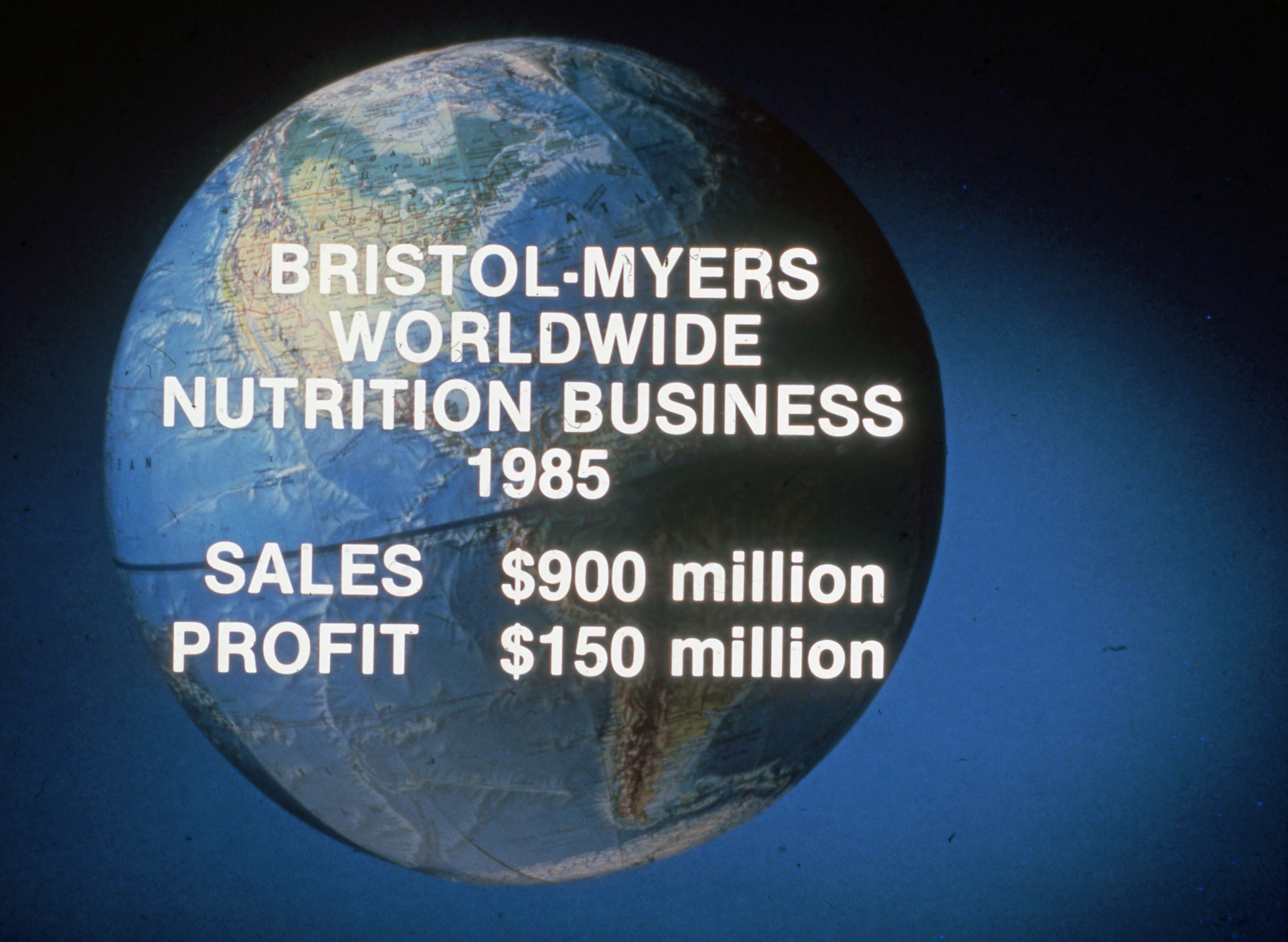 Business presentation of a globe with the words "Bristol-Myers Worldwide Nutrition Business 1985 Sales $900 million Profit $150 million" superimposed