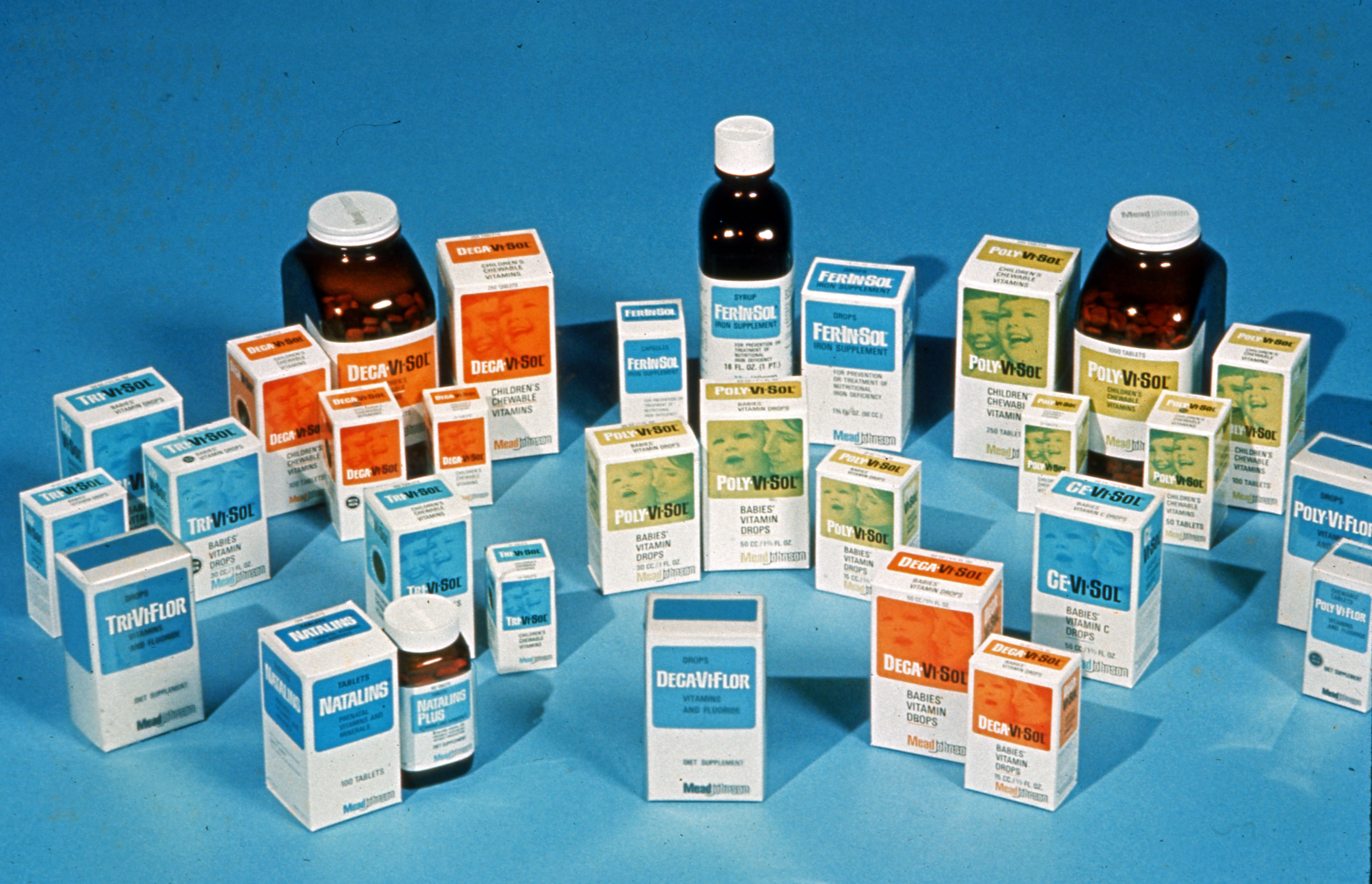 Product samples of vitamin products: Deca-Vi-Sol, Tri-Vi-Sol, Poly-Vi-Sol, Natalins, Fer-in-Sol, and Ge-Vi-Sol in various formats
