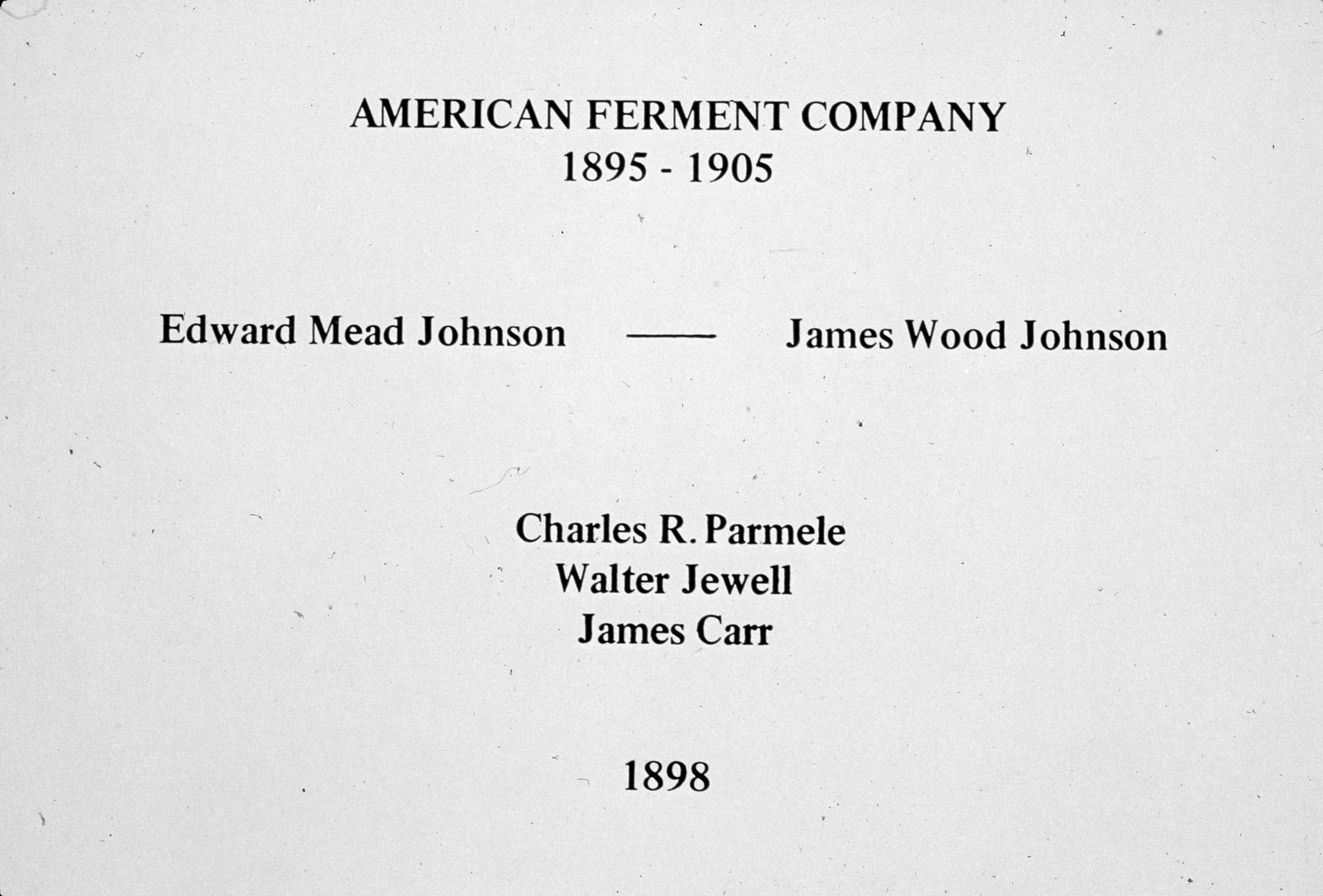 Graphic of the pre-history of the Mead Johnson Company. James Wood Johnson and his brother Edward Mead Johnson operated the American Ferment Company 1895-1905 in Jersey City, New Jersey. In 1905 the name was changed to Mead Johnson and the company soon op